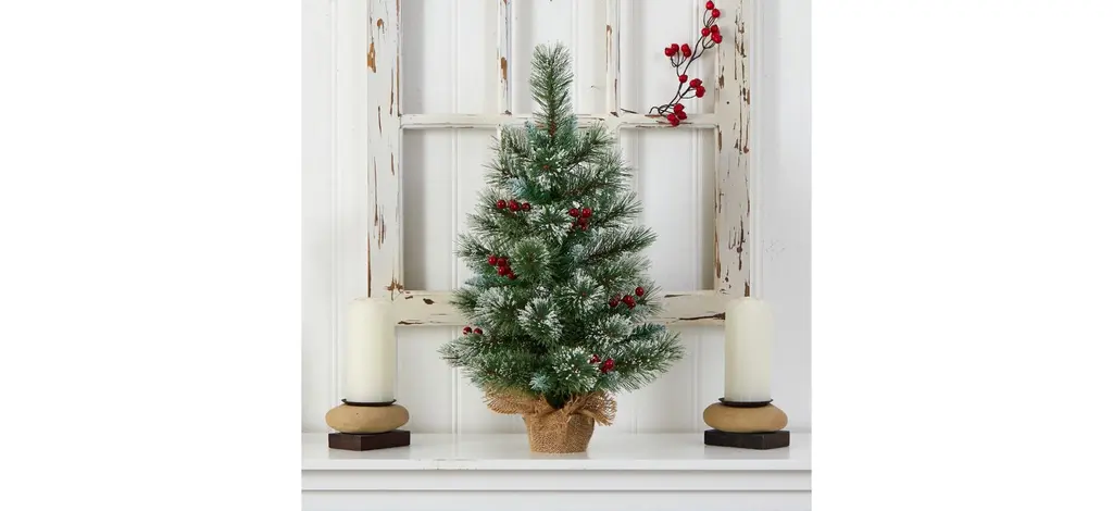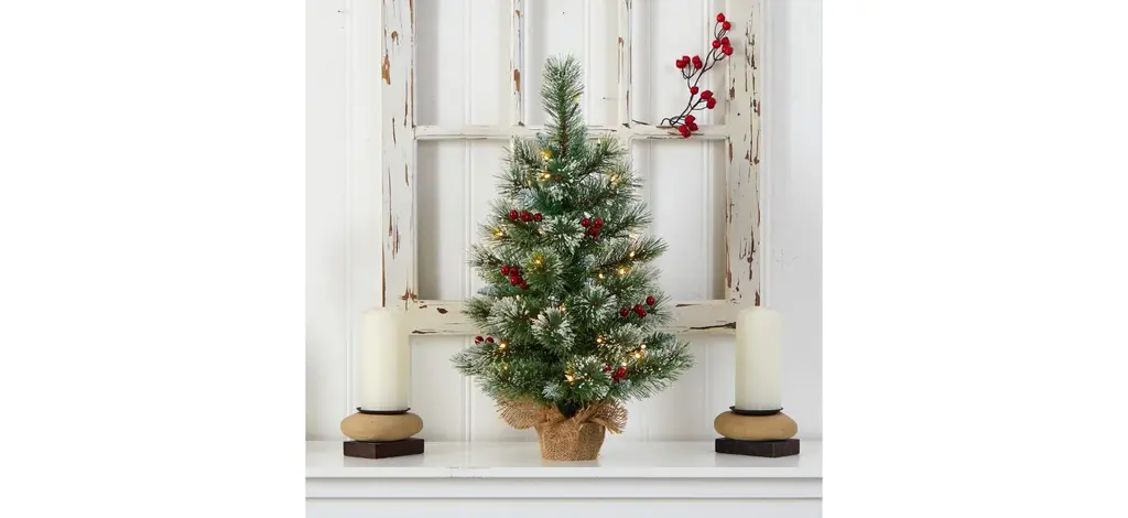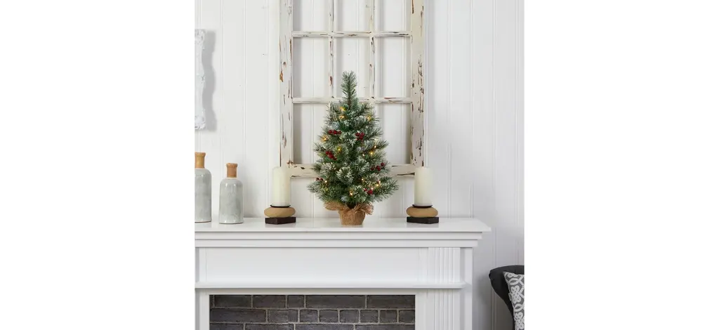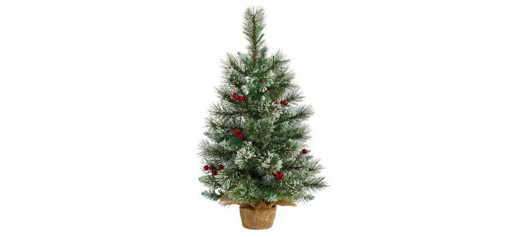 Spread holiday cheer to any tabletop with this 2" Snow Tipped Pine and Berry Artificial Christmas Tree with Warm White LED Lights in Burlap Base. Lush, PVC needles are lightly dusted with snow and accented throughout with berries that look incredibly lifelike. This mini faux tree comes pre-lit with 35 lights and 50 bendable branches to save you time and money. Perfect for an office, desktop or any tight area. Your artificial Christmas Tree will look beautiful for years to come; simply wipe clean with a soft dry cloth when needed.