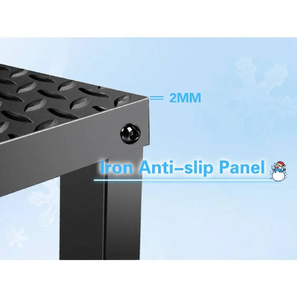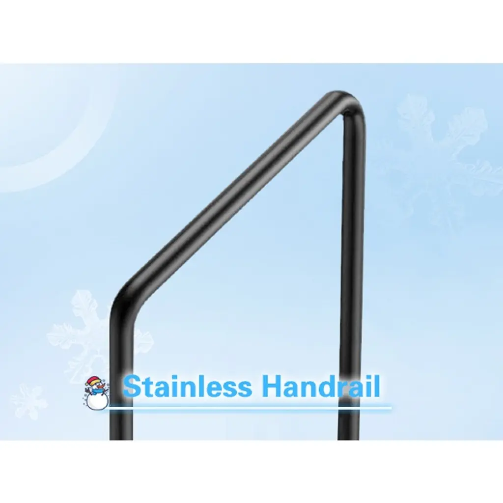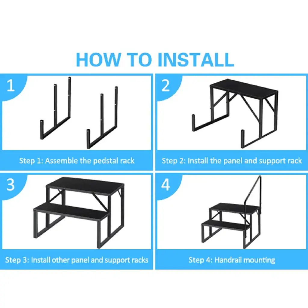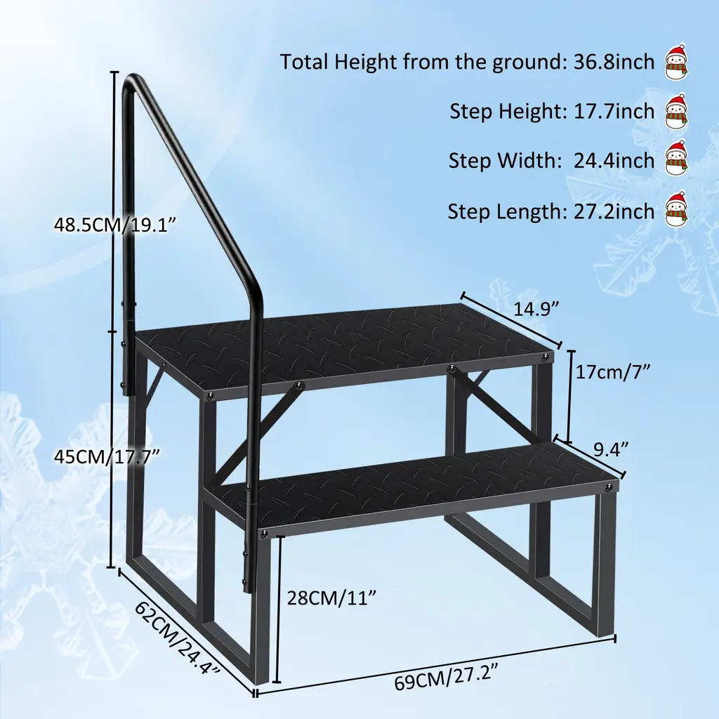 Specification: Key Features: Description: This 2-step ladder with a handrail is a durable and reliable solution for reaching high areas like RVs, hot tubs, or mobile homes. Built with heavy-duty iron, it supports up to 660 lbs and offers stability with its triangular bar design. The upgraded 1.8mm anti-slip panel ensures safer use, even in wet environments, while the handrail provides extra security. Easy to install, the ladder can be mounted on either side, and its detachable design allows for convenient storage when not in use. Perfect for a variety of outdoor and indoor applications, including travel trailers and warehouses.