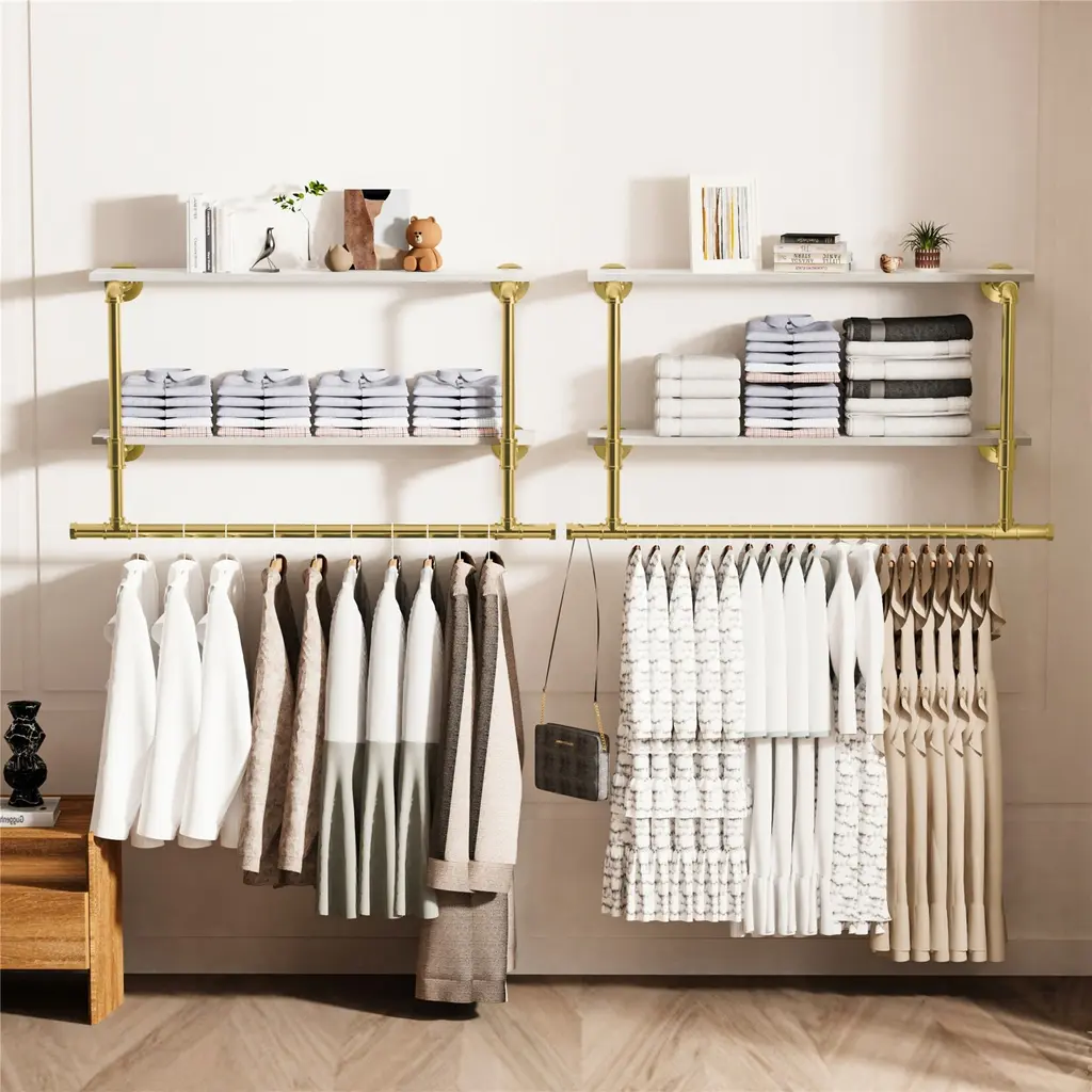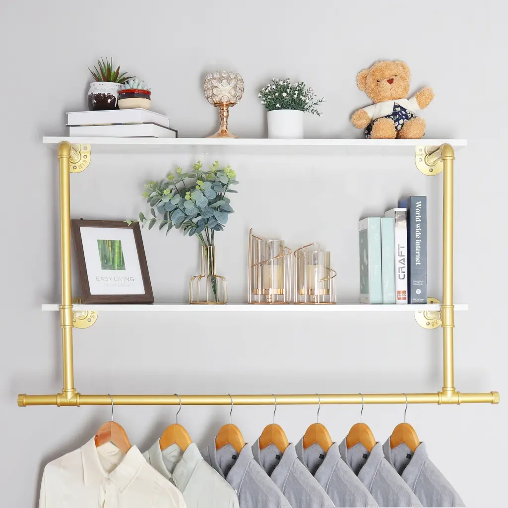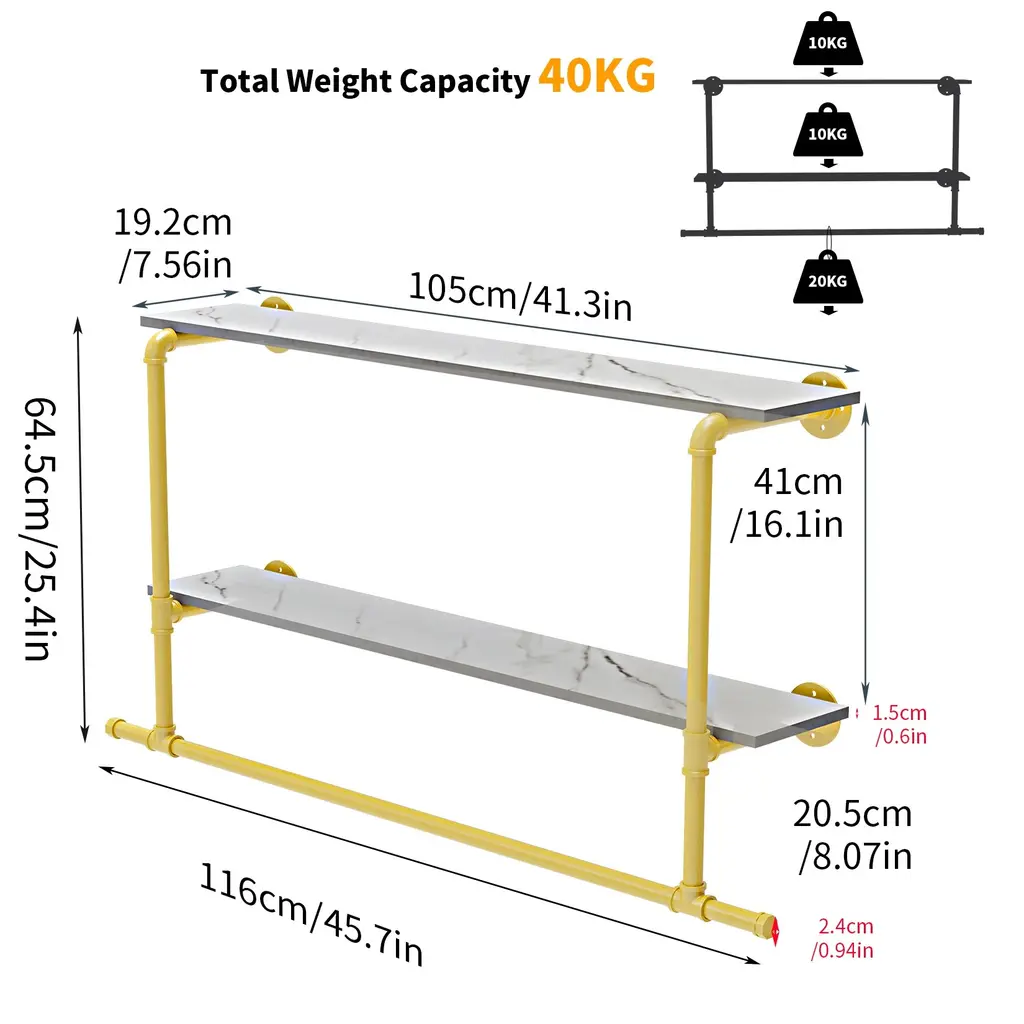 2 Tier Clothes Display Rack Pipe W/wood Shelves For Garment Storage - Golden And Marble White