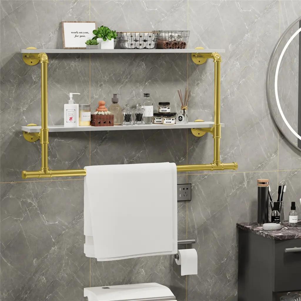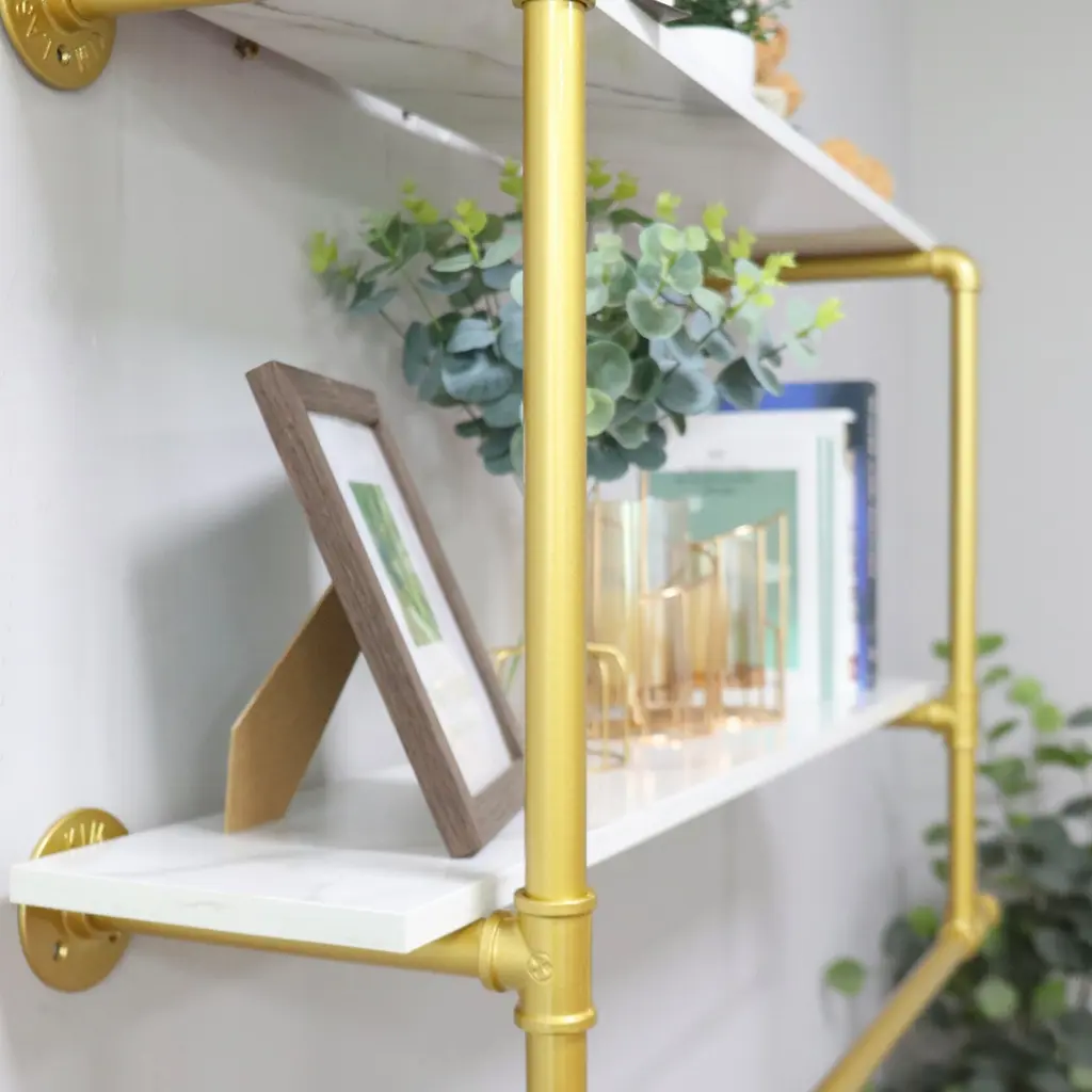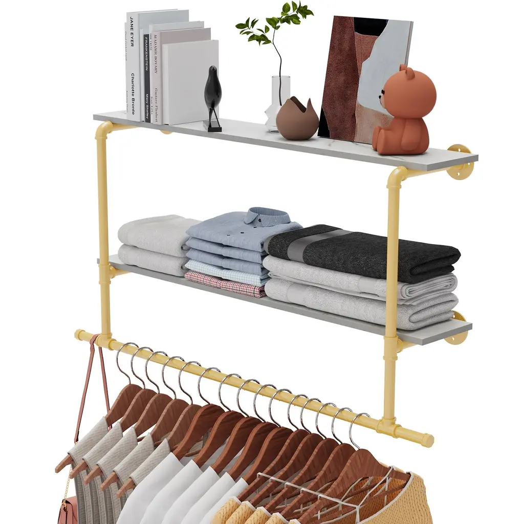 2 Tier Clothes Display Rack Pipe W/wood Shelves For Garment Storage - Golden And Marble White