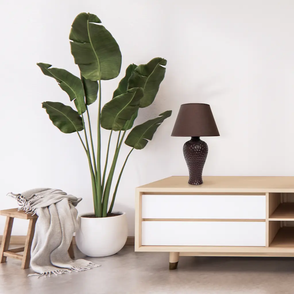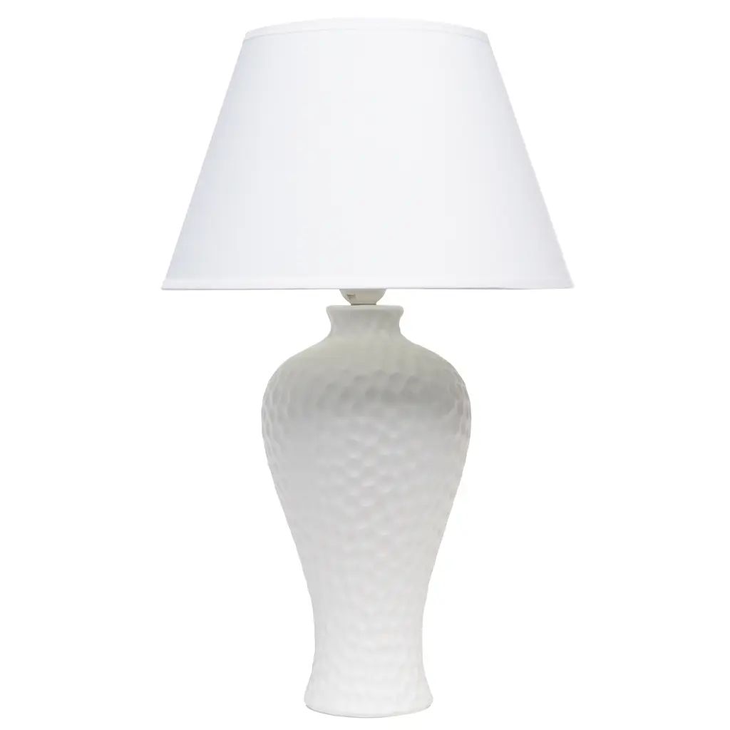 This beautifully designed table lamp made primarily of ceramic features a bendy and curvy shape with an imprint style texture throughout its painted base, in the color of your choice. It is then paired with a matching empire fabric shade that compliments its surrounding environment perfectly while illuminating your space just right. Features: