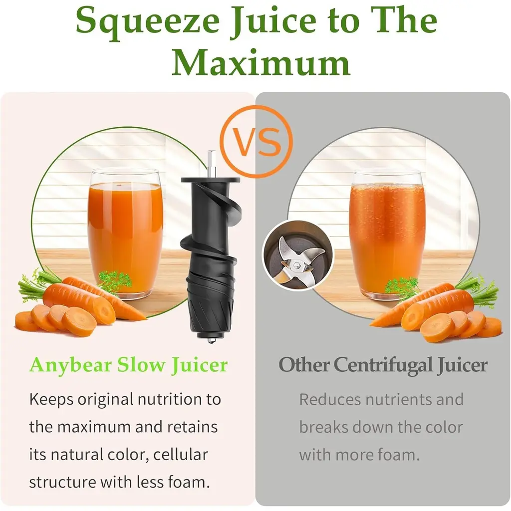 【 High-speed Power】Anybear masticating juicer machines with a motor powred up to 200W, paired with this 95-110 RPM system shifts speed dynamically based on the hardness of the ingredient, effortlessly extract juice at low speeds to produce a high juice yield to the utmost extent with minimal waste. 【Large Feed Chute】This cold press juicer adopts the industry-first 90mm wide feed chute allows you to drop whole fruits—no slicing, no dicing, just pure juice-making convenience at lightning speed, reducing prep time by up to 50%. 【Whisper-Quiet Magnetic Drive Motor】 Utilizing next-gen magnetic drive technology, our juice extractor machine operates at less than 60dB noise level. It delivers powerful performance while staying virtually silent. Enjoy a peaceful kitchen atmosphere—even during peak juicing. 【5-Speed & Energy-Saving Mode 】Anybear transfers the highly energy conservation, the green environmental protection idea into the juicer. It offers 5 gears for different fruits vegetables. Each number corresponds to a different operational speed, just by choosing the mode according to the hardness of the fruits and vegetables to get high yield juices! Among them, levels 1, 2, 3 are enery-saving modes, which can save electricity consumption. The lower the gear, the more electricity can be saved. 【High Fiber Processing Power】 Engineered with enhanced torque and precision cutting, this juicer tackles high-fiber vegetables with ease—think kale, celery, beets, and carrots—transforming even the toughest greens into silky-smooth juice without compromising nutrients or texture. 【Durable Stainless Steel Construction】Unlike other juicers, except the durable stainless steel juicer body, our auger is very robust and also being made of stainless steel instead of pure plastic. The auger can not horizontally sway in the juicing process, so by stainless steel juice, it attains maximum juice yield, minimum oxidation, maximum nutrient retention and prolongs the auger service life. 【Easy to Disassemble and Clean】 Anybear juicer machine is easy to assemble, allowing you to set it up quickly and save your time. By pushing the button on the juicer body, you can disassemble it in minutes. It is equipped with a cleaning brush to make the juicers cleaner easier.