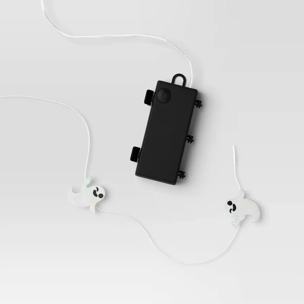 Illuminate your festive setup with the ghostly glow of these 20-Count LED 2D Iridescent Plastic Ghost With Peace Sign Halloween Dewdrop String Lights from Hyde and EEK! Boutique™. These decorative string lights showcase a silver-hued wire strung with white iridescent ghosts making peace signs and fitted with 20 white LED bulbs to glow up your space. Suitable for indoor and outdoor use, these battery-powered string lights are great for decorating your entryway, backyard, porch or patio for a touch of creepy-cool vibes.Hyde and EEK! Boutique™: Thrilling delights. Curious oddities.