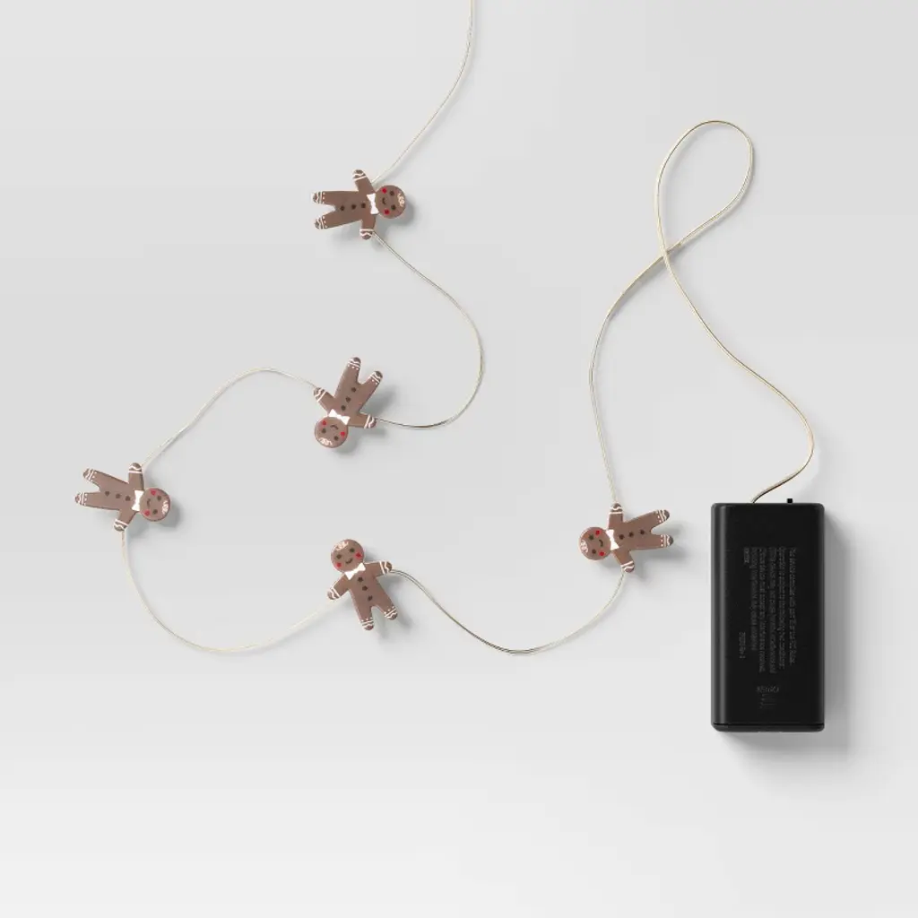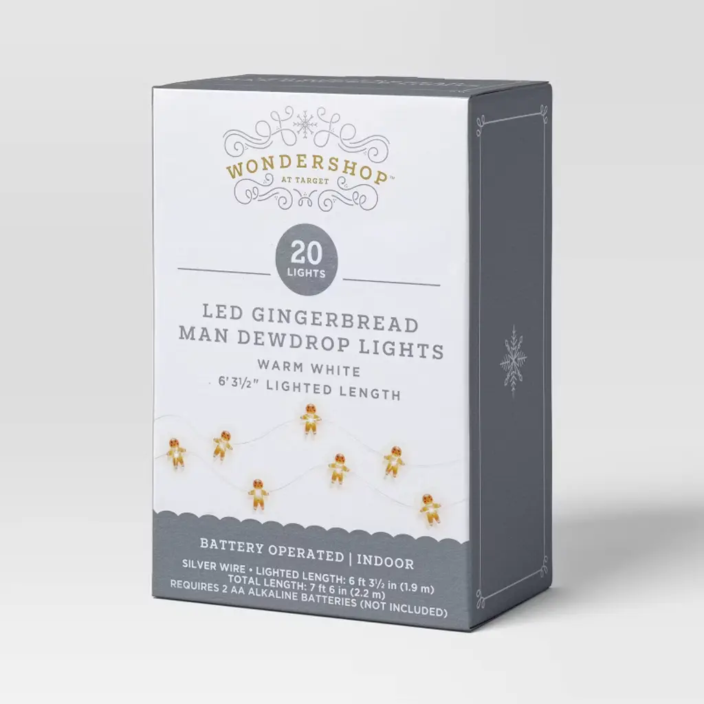 Anchor your seasonal display with the magical glow of these LED Battery Operated Christmas Gingerbread Man Dew Drop Lights Warm White with Silver Wire from Wondershop™. Featuring a silver wire strung with brown gingerbread and fitted with 20 warm white dewdrop LED bulbs, these novelty string lights add an adorable, glowing touch to indoor spaces. Weave these lights through bookshelves or countertops, spiral them around your Christmas tree, or wind them around a mirror for a festive, fun look.Welcome to the Wondershop™.