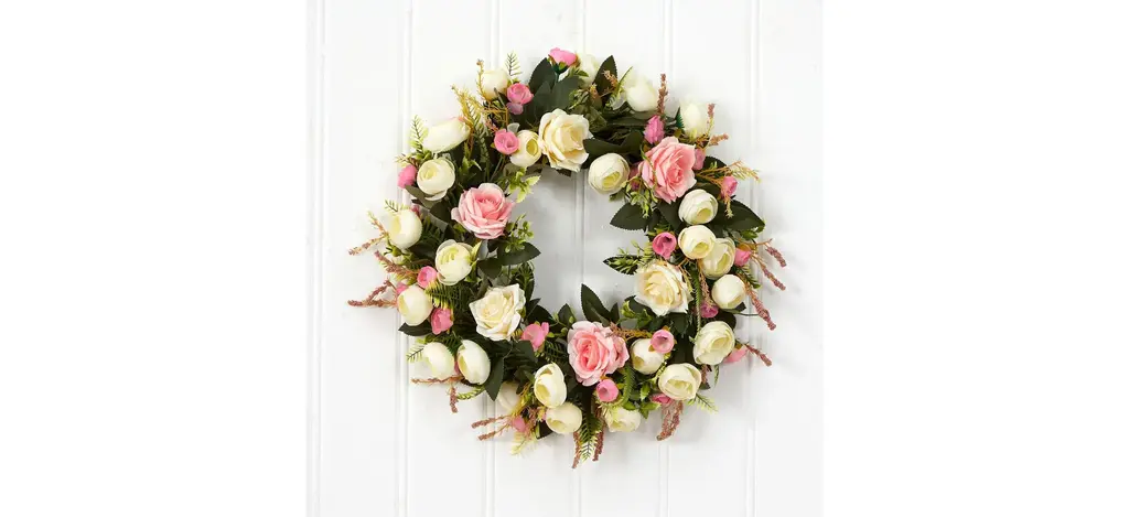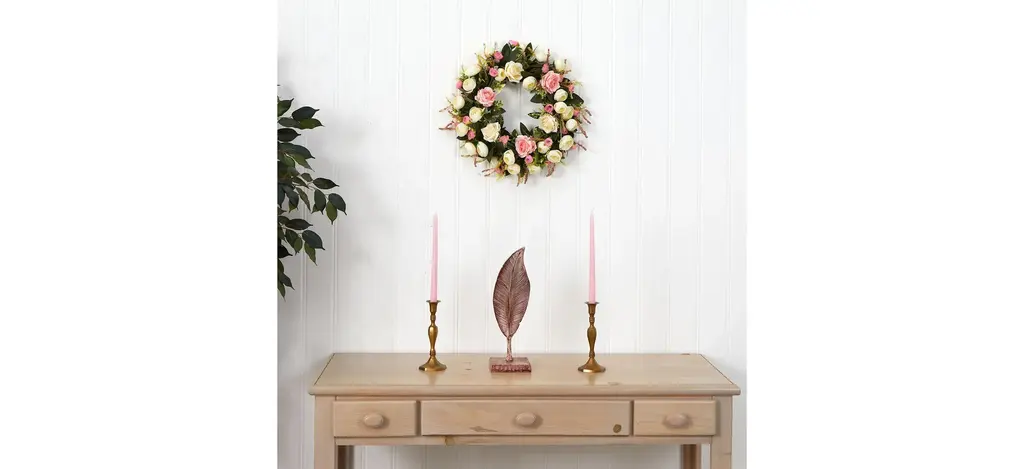 What better way to greet guests than with a 20in White & Pink Rose Artificial Wreath. Roses are some of the most recognized flowers and this nature-inspired wreath displays silk roses in a palette of pastel hues, nestled between leaves, for a seasonal touch. Crafted from high-quality materials, you'll notice the detailing on throughout. With a diameter of 20", hang in any area. Ideal for a bare corner, door or lonely wall.