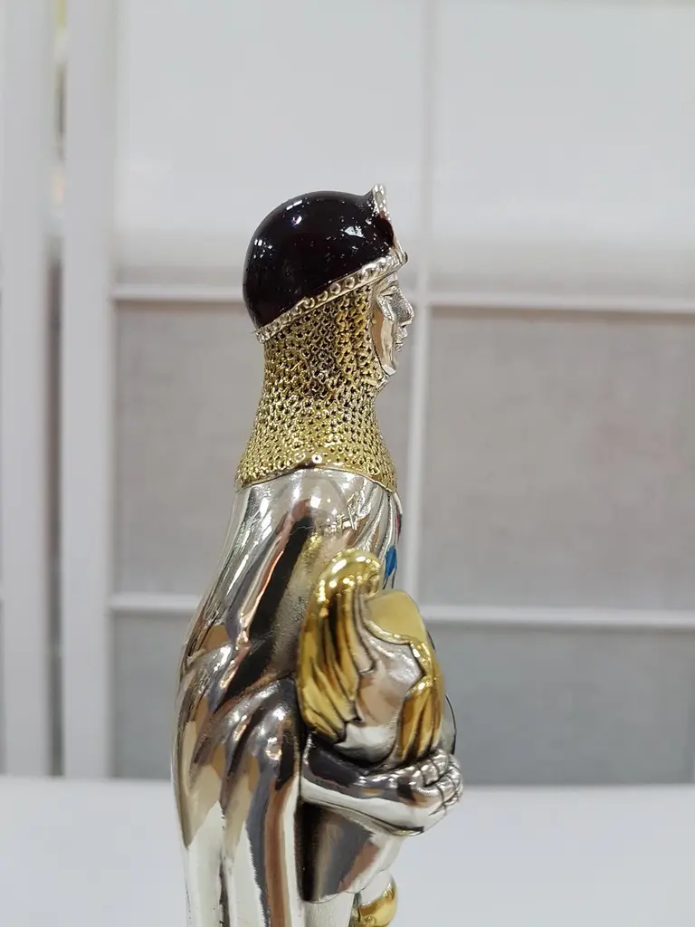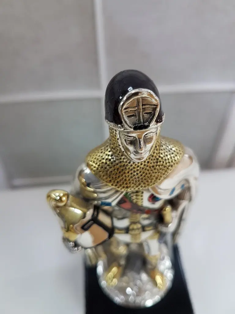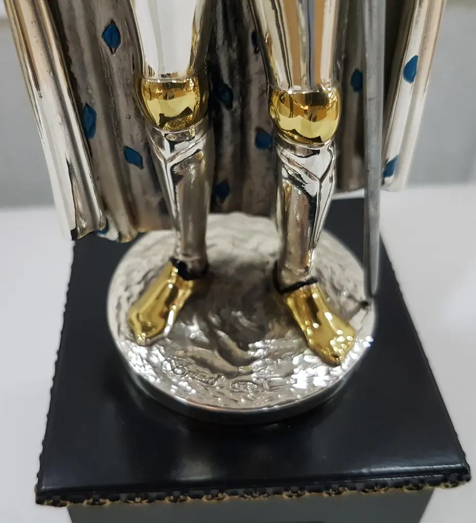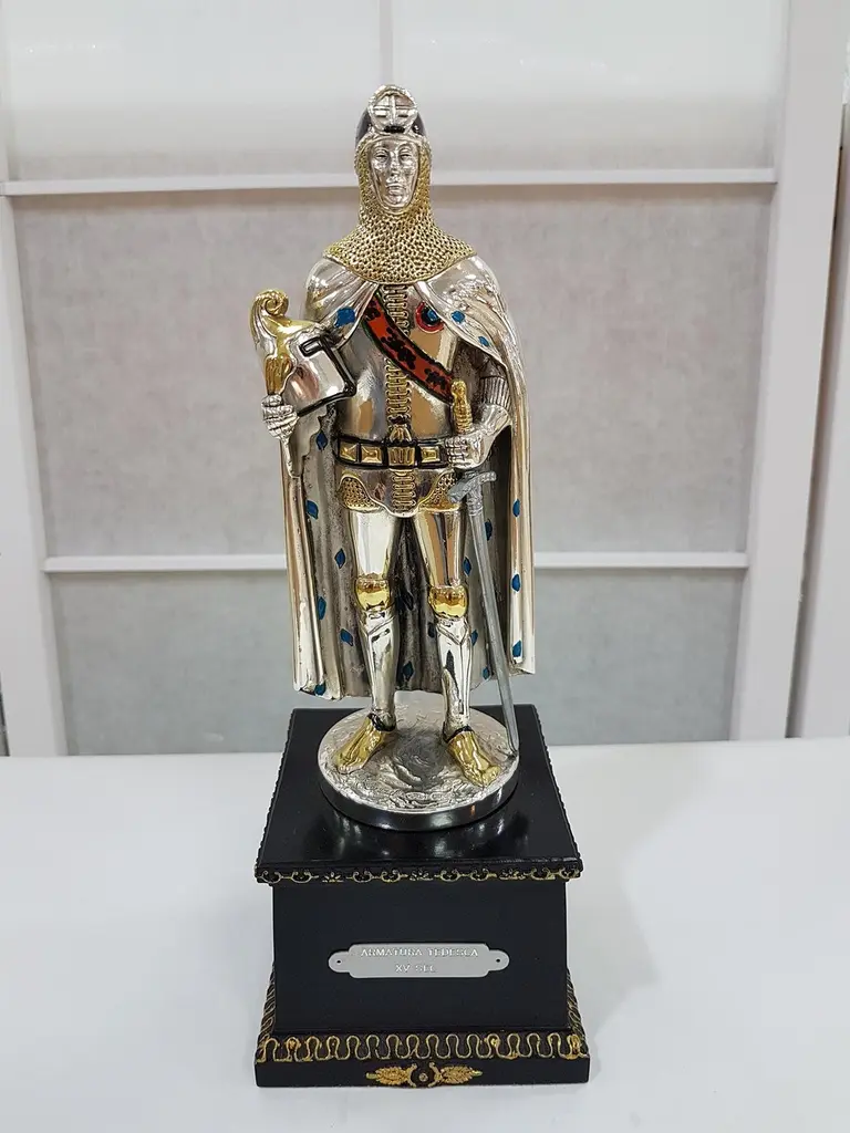 Figure realized in Sterling Silver using the lost wax process.The details are gilded and enameled.The figure is 17.5 cm high and depicts a 15th century German soldier with sword and helmet in his righr handThe wood square base is 7 cm high where there is an engraved label"Armatura Tedesca XV° Secolo", "German Armour 15th century".