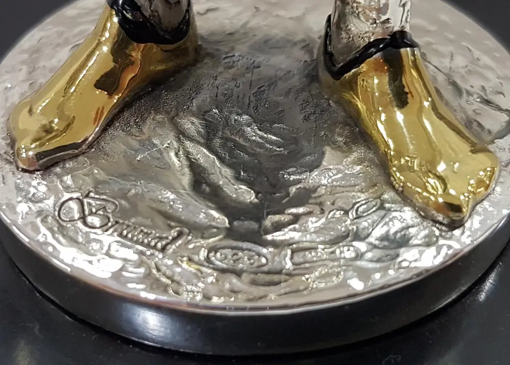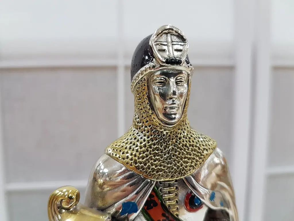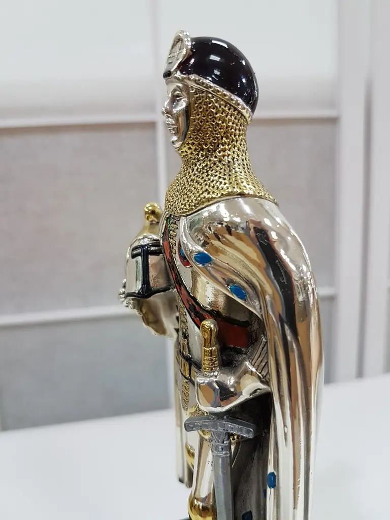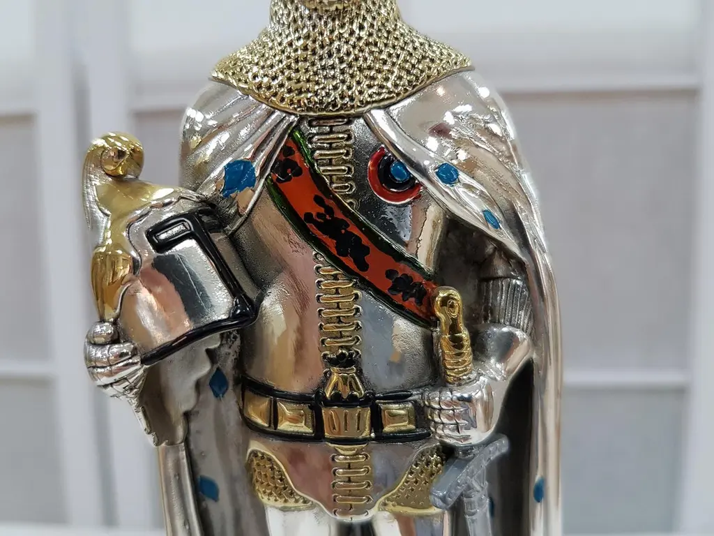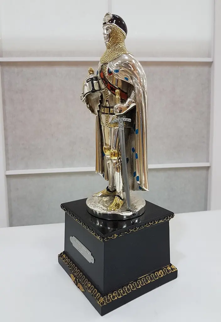 Figure realized in Sterling Silver using the lost wax process.The details are gilded and enameled.The figure is 17.5 cm high and depicts a 15th century German soldier with sword and helmet in his righr handThe wood square base is 7 cm high where there is an engraved label"Armatura Tedesca XV° Secolo", "German Armour 15th century".
