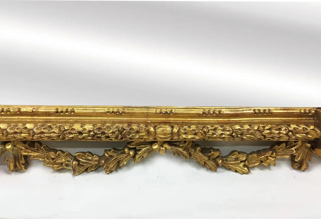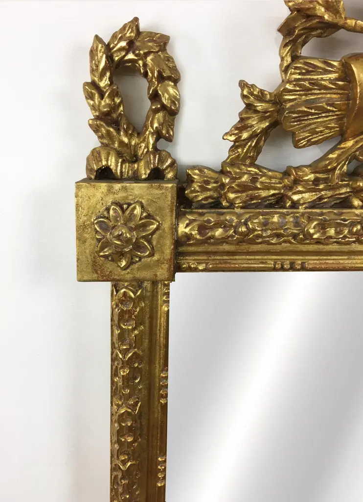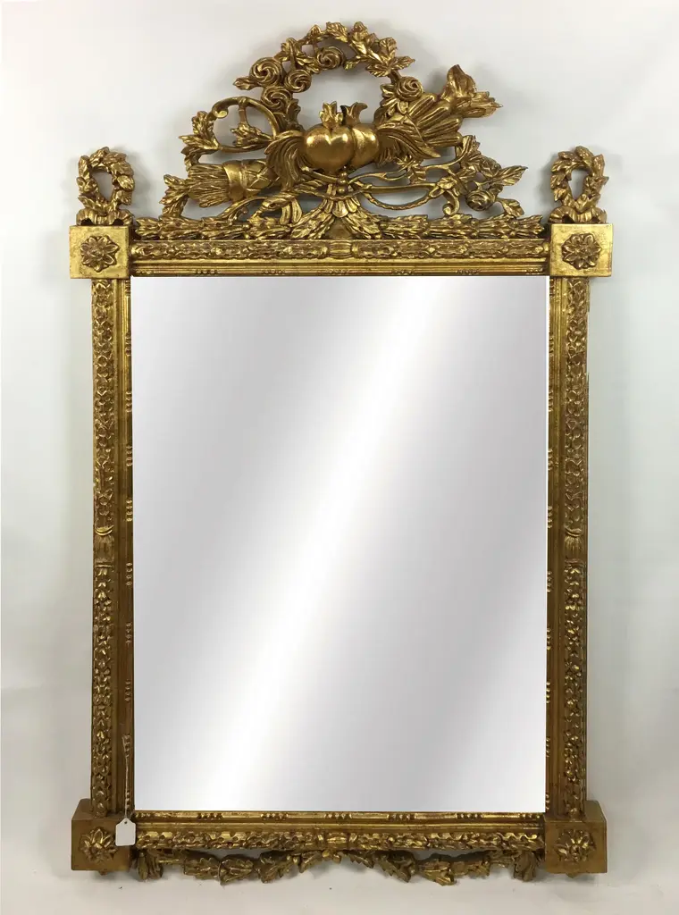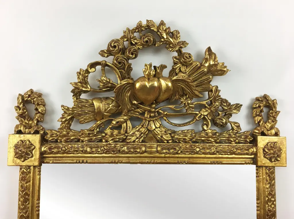 The frame of this large antique mirror is richly carved in the Baroque style and features extensive gilt detail, leaves, and a crest of twin winged hearts. This piece is an elegant addition to any home.