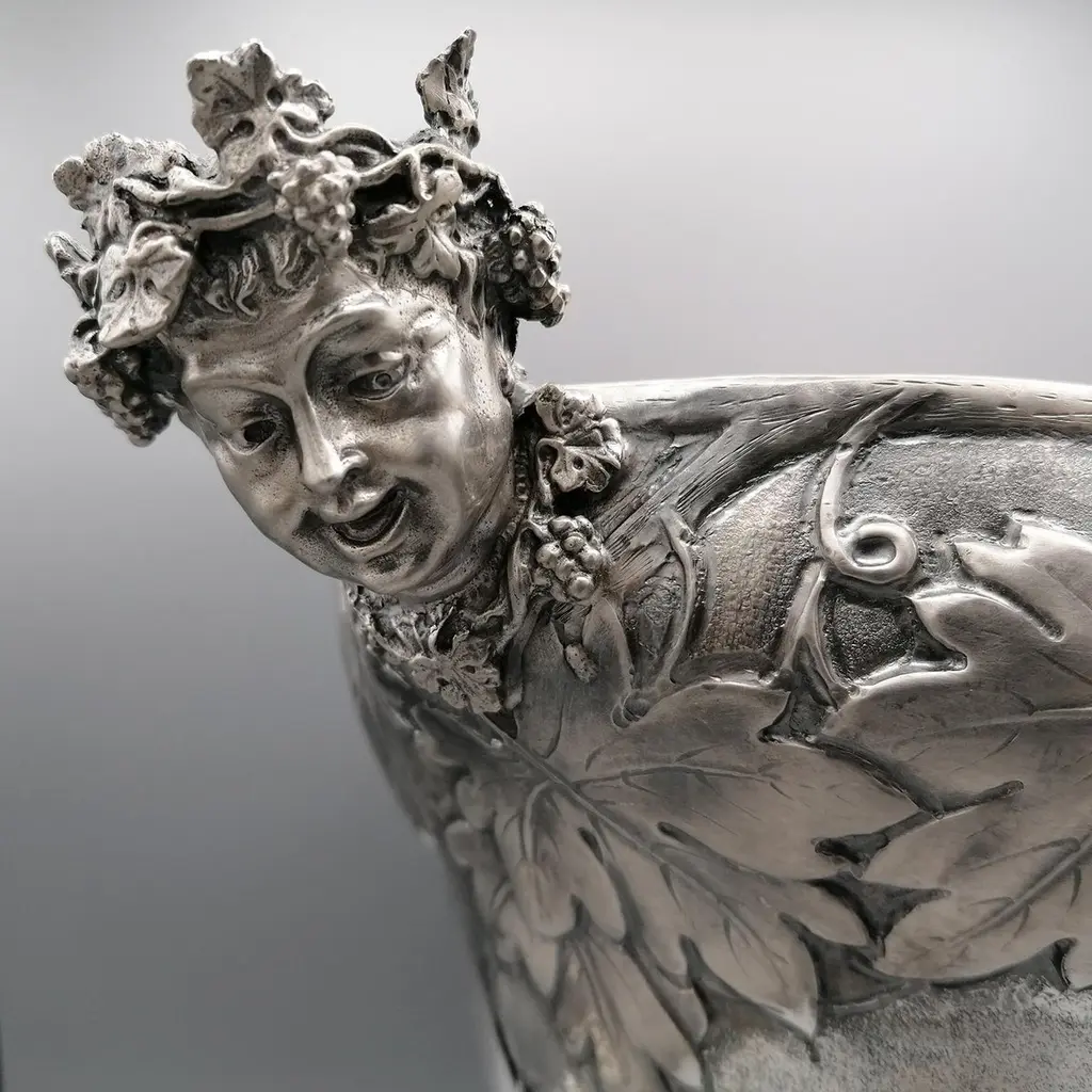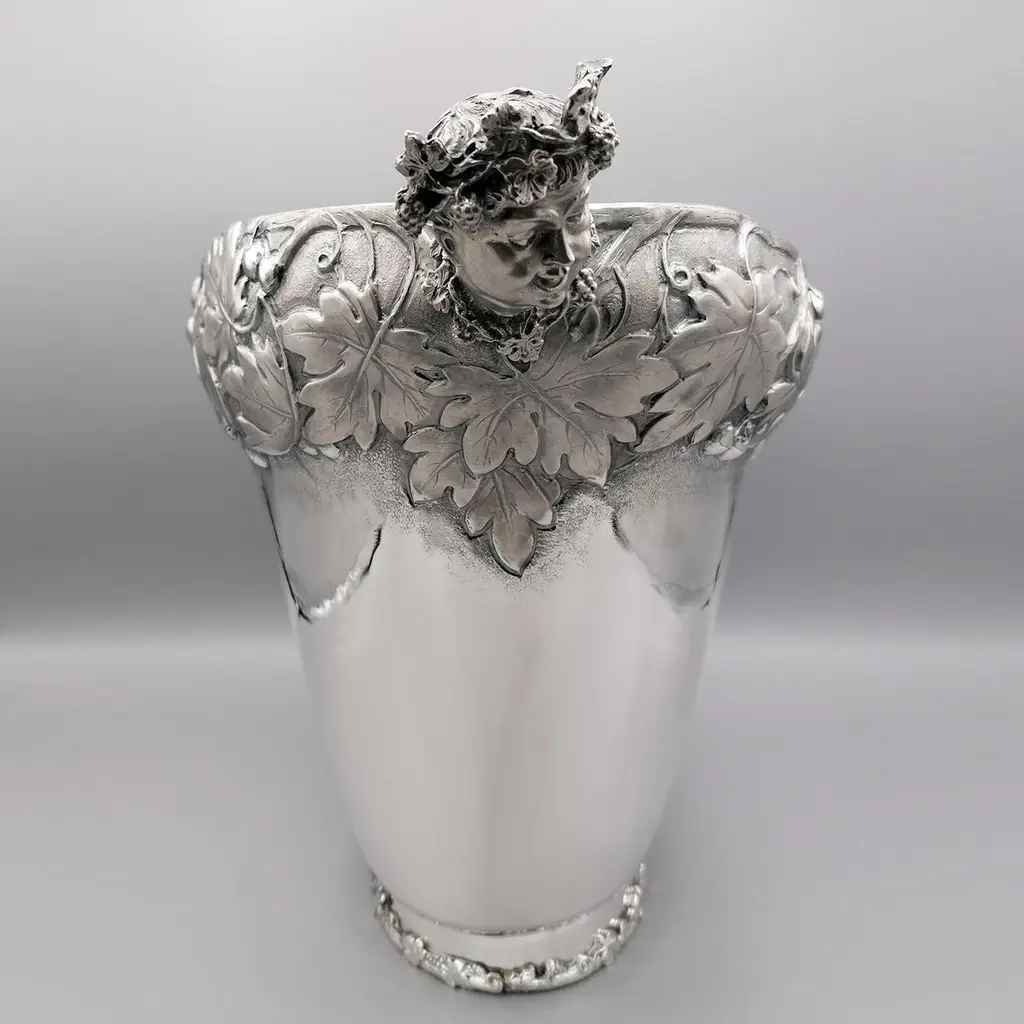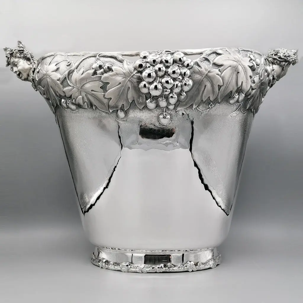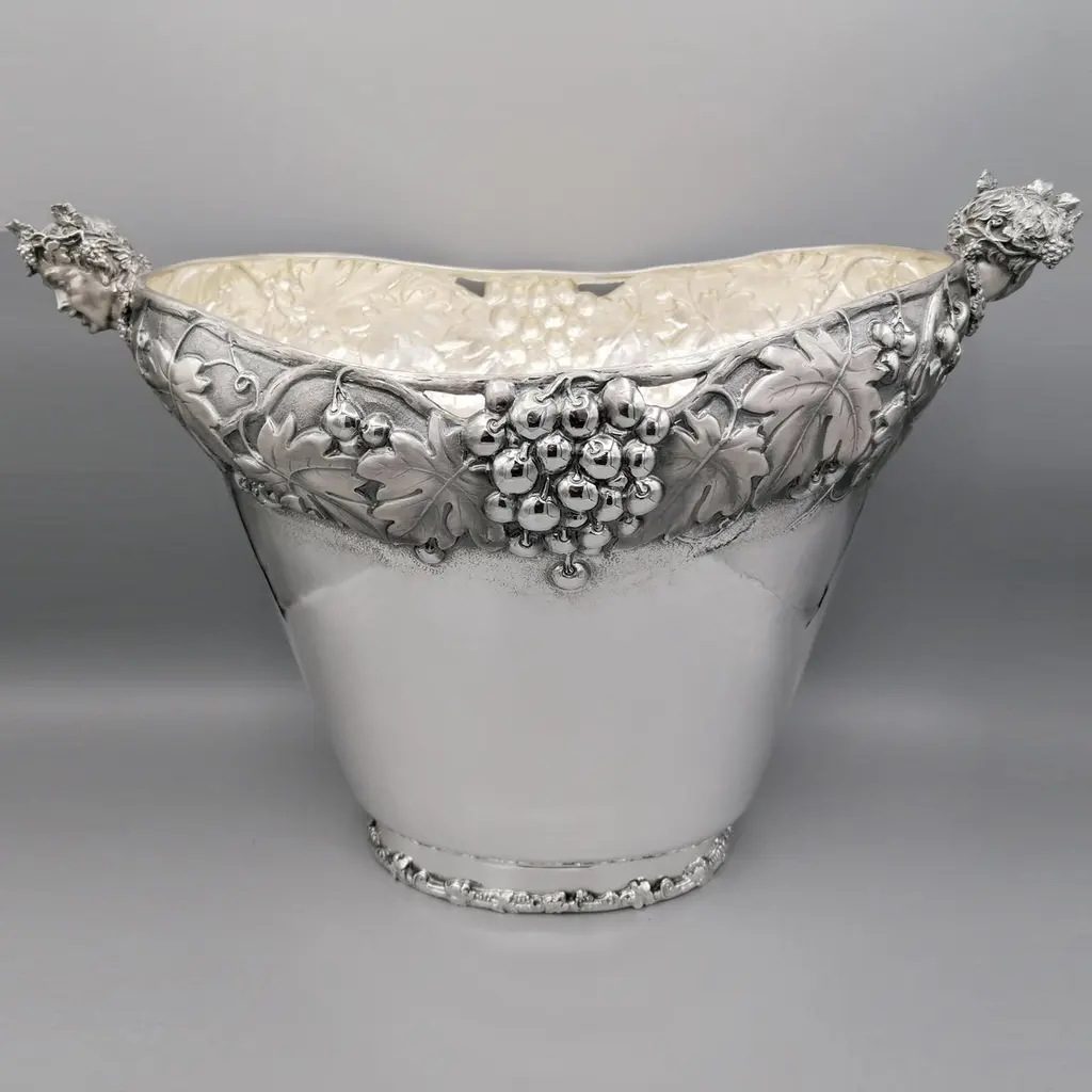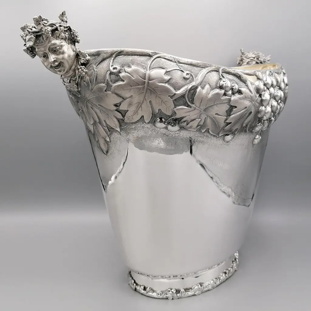 Large champagne bucket in 800 solid silver.Completely handmade, it was made by hammering a silver plate and giving it the shape of a 2-seater champagne bucket,The upper barrel was then later embossed, symmetrically reproducing bunches, shoots and grape leaves which were then burnished to highlight the beauty of the workmanship.The heads of the god Bacchus were welded in fusion and then chiseled by hand instead of the handles to facilitate their grip and handling.Italian silverware, already with a centuries-old tradition, had a great development in the twentieth century and produced pieces of the highest quality that the whole world envies. Italian craftsmanship had a kind of new Renaissance after the war. A great many high-quality silverware was born where exceptional pieces were produced that now decorate the most prestigious houses.