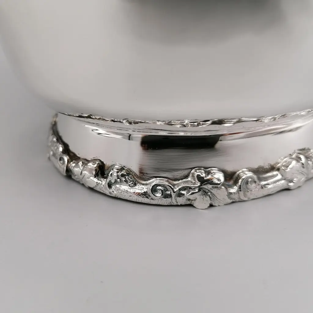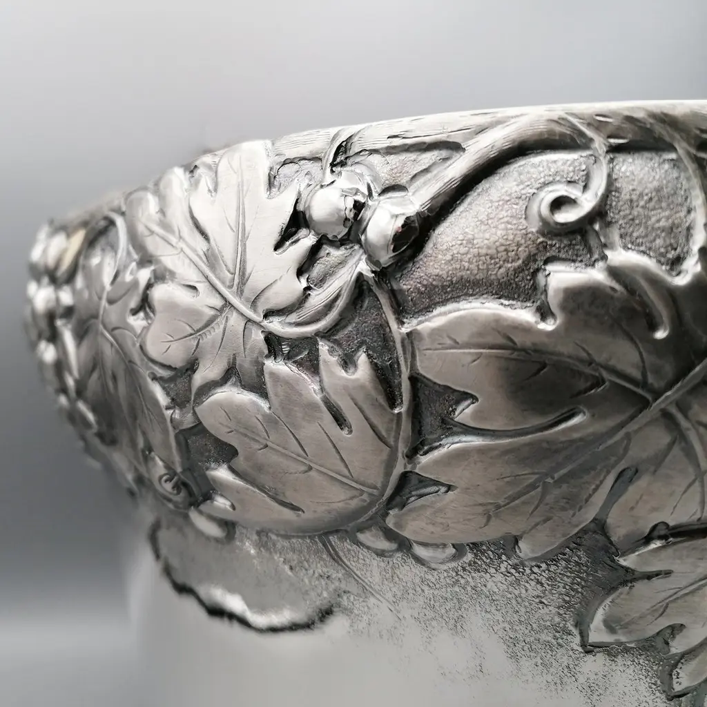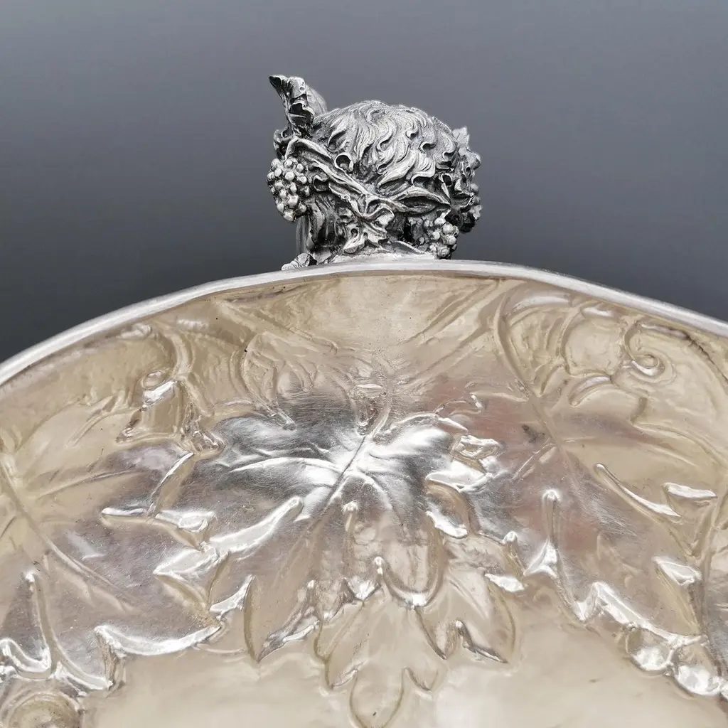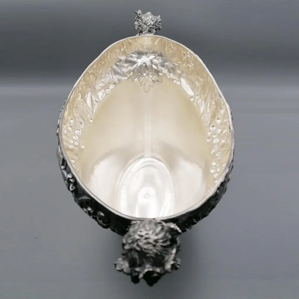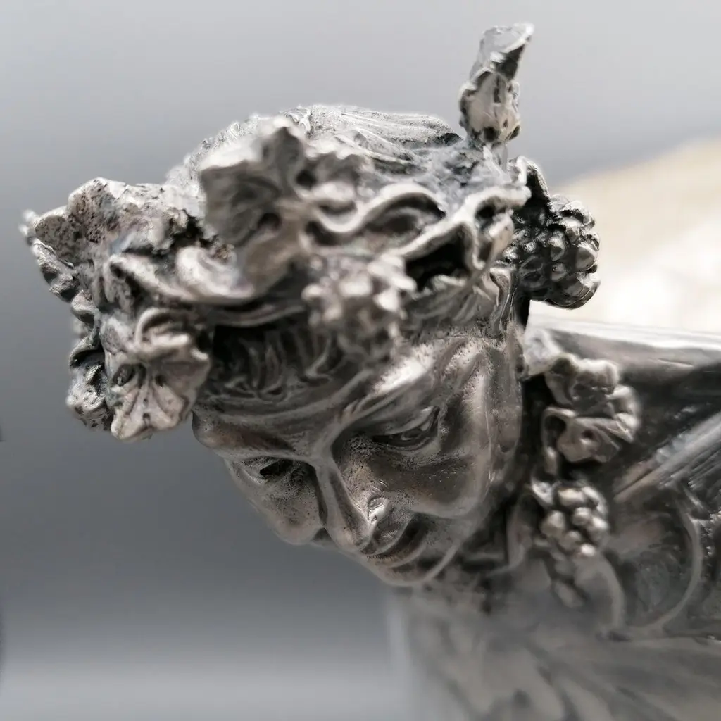 Large champagne bucket in 800 solid silver.Completely handmade, it was made by hammering a silver plate and giving it the shape of a 2-seater champagne bucket,The upper barrel was then later embossed, symmetrically reproducing bunches, shoots and grape leaves which were then burnished to highlight the beauty of the workmanship.The heads of the god Bacchus were welded in fusion and then chiseled by hand instead of the handles to facilitate their grip and handling.Italian silverware, already with a centuries-old tradition, had a great development in the twentieth century and produced pieces of the highest quality that the whole world envies. Italian craftsmanship had a kind of new Renaissance after the war. A great many high-quality silverware was born where exceptional pieces were produced that now decorate the most prestigious houses.