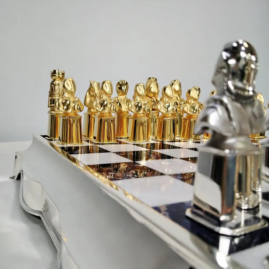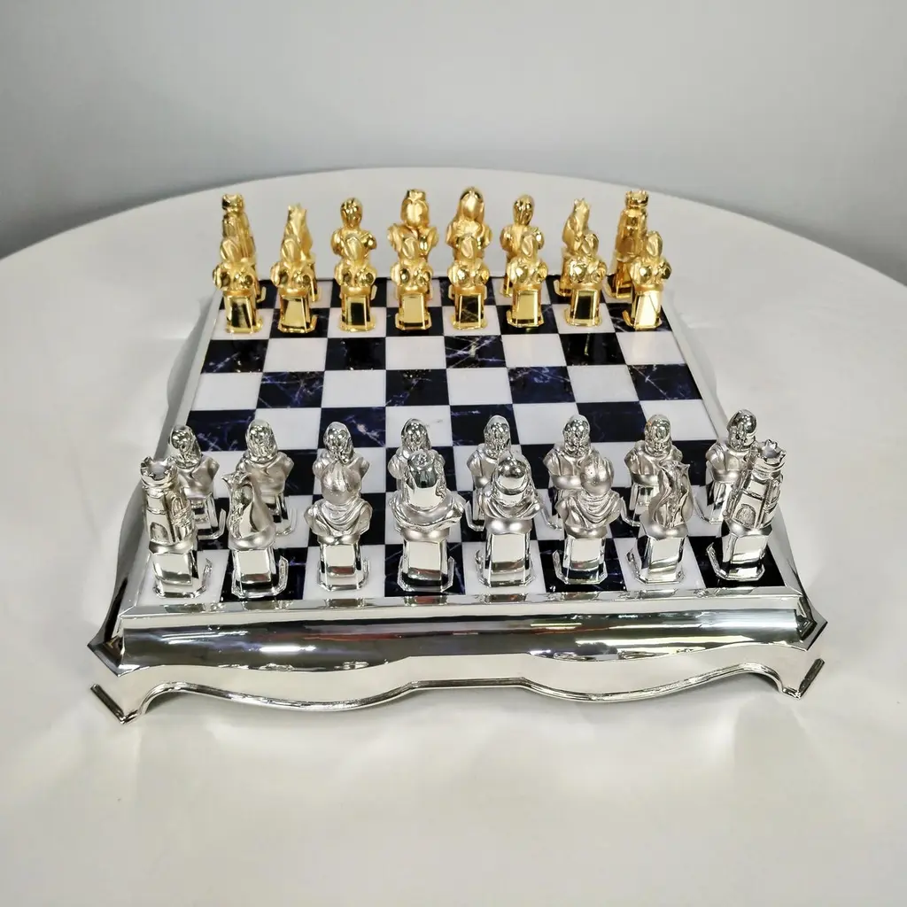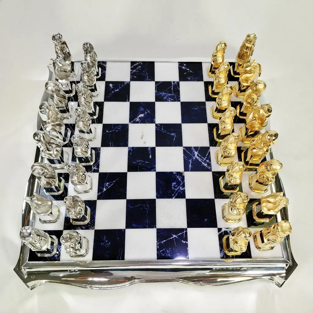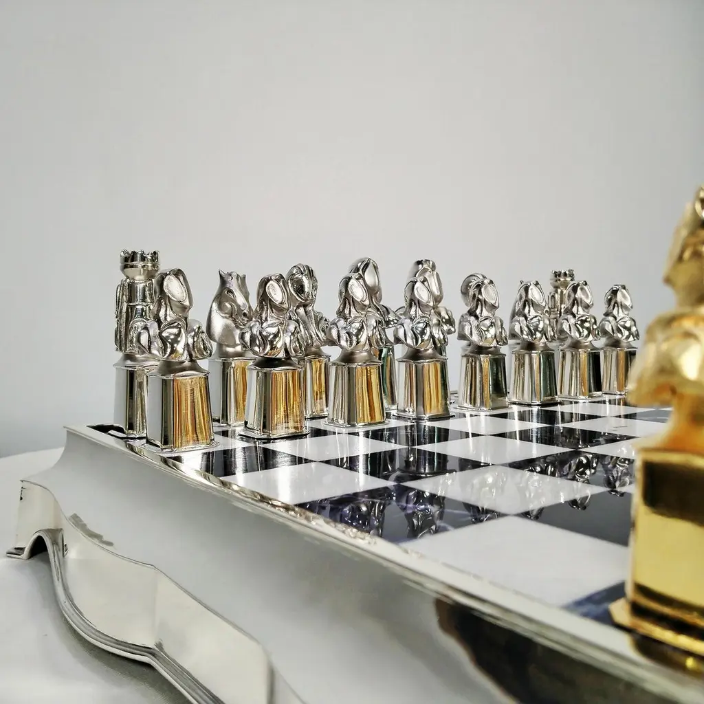 Solid sterling silver chessboard with a chess game inspired by the works of sculptor De Chirico. Sodalite top.The chess set features a silver finish for one player, while the other player has a 24kt gold-plated silver finish. To give the pieces movement, the finish on both pieces has been differentiated, with polished and satin parts. The upper part of the chess pieces was cast using a casting technique, while the lower part is made of hand-molded sheet metal, inspired by the paintings of the famous contemporary Italian painter Giorgio De Chirico.The base, also made of solid 925 silver, was shaped and hammered entirely by hand.The chessboard is made of two-tone white and blue sodalite.gr. 5810Made in the second half of the 20th century in the artisanal silversmith workshop of ARVAL ARGENTI VALENZA - Italy