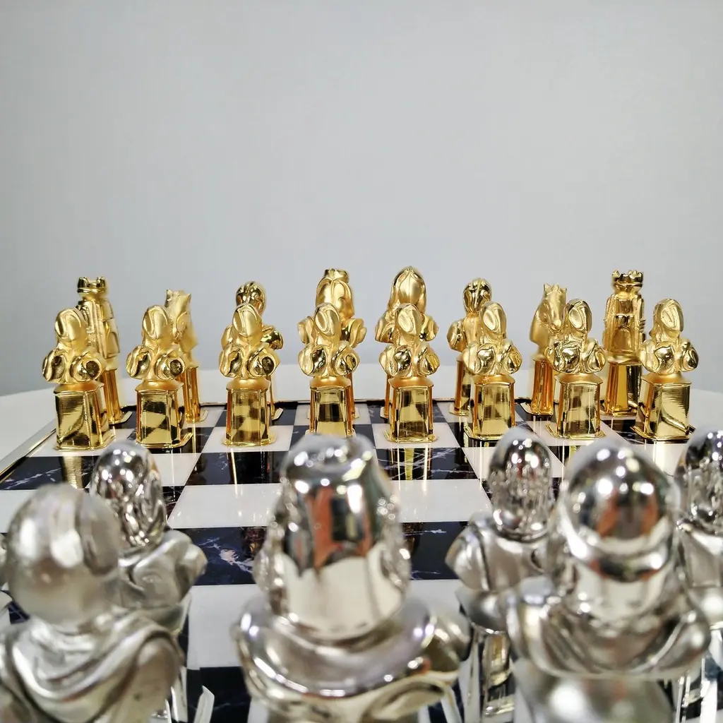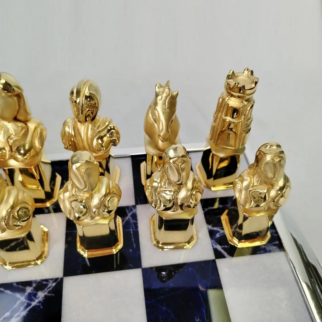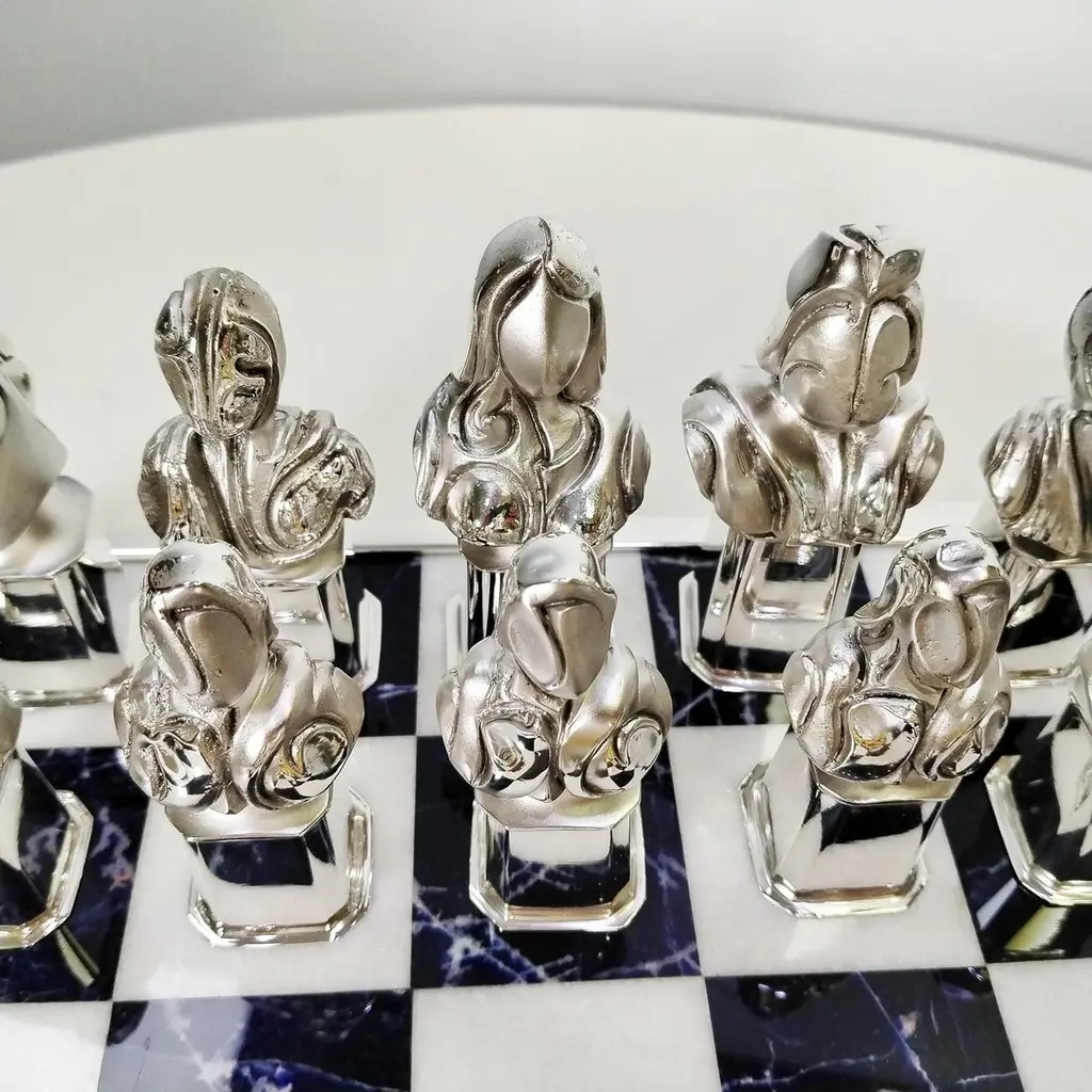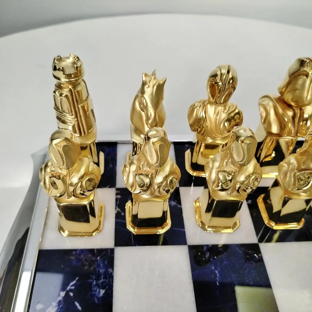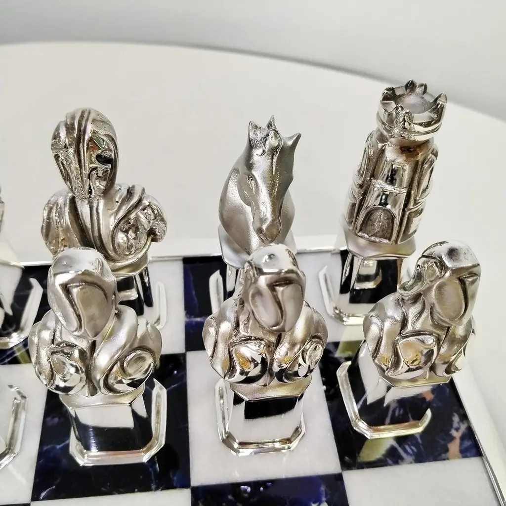 Solid sterling silver chessboard with a chess game inspired by the works of sculptor De Chirico. Sodalite top.The chess set features a silver finish for one player, while the other player has a 24kt gold-plated silver finish. To give the pieces movement, the finish on both pieces has been differentiated, with polished and satin parts. The upper part of the chess pieces was cast using a casting technique, while the lower part is made of hand-molded sheet metal, inspired by the paintings of the famous contemporary Italian painter Giorgio De Chirico.The base, also made of solid 925 silver, was shaped and hammered entirely by hand.The chessboard is made of two-tone white and blue sodalite.gr. 5810Made in the second half of the 20th century in the artisanal silversmith workshop of ARVAL ARGENTI VALENZA - Italy