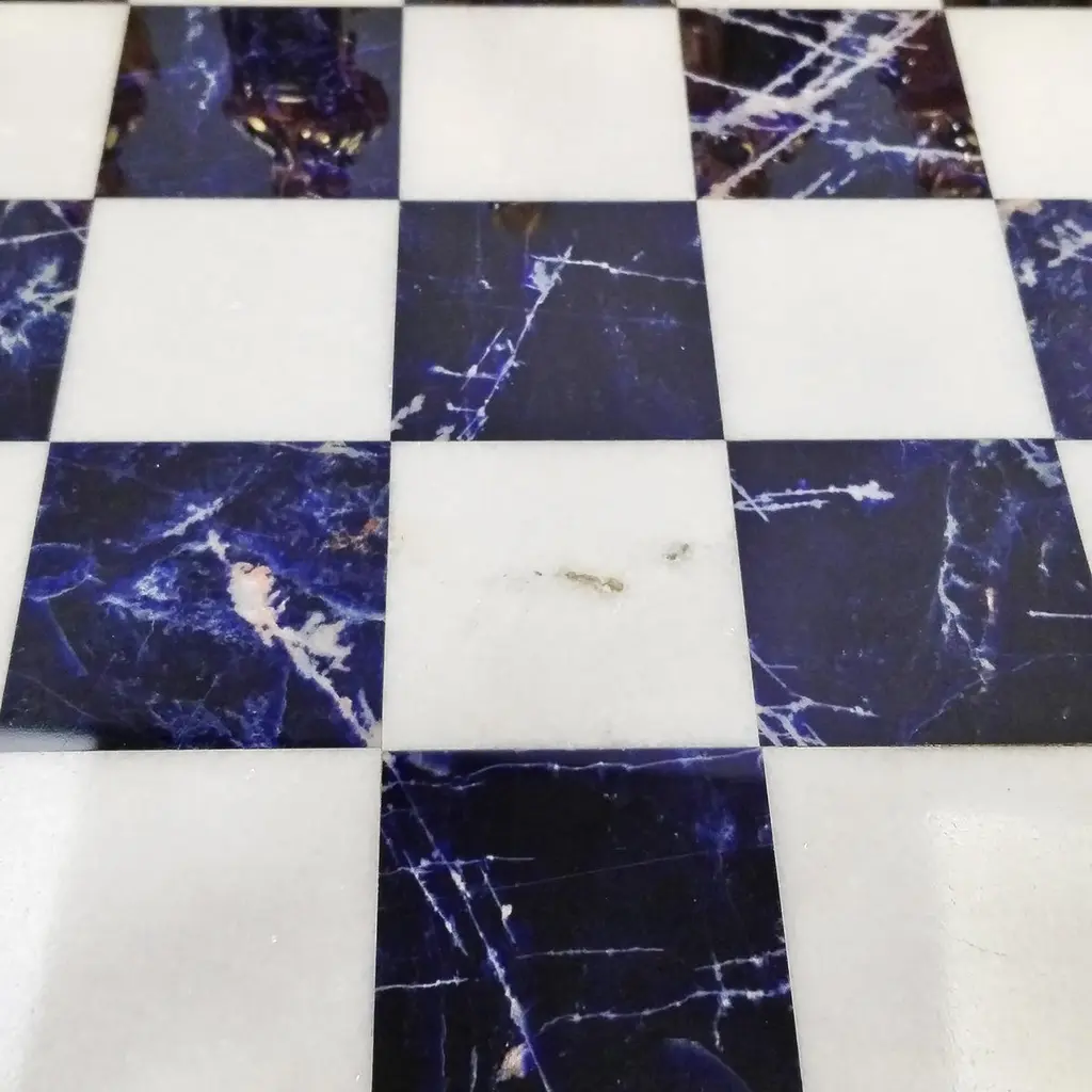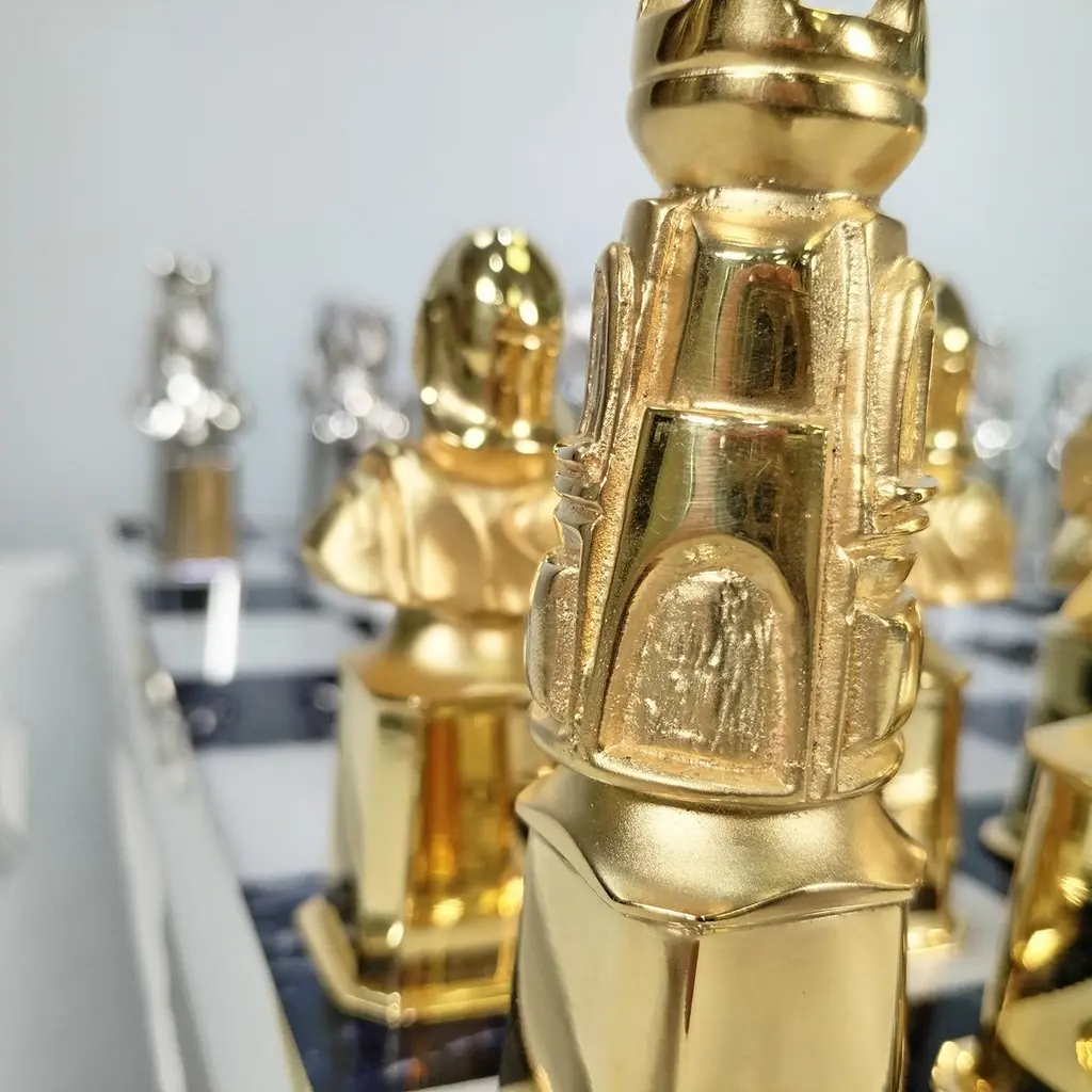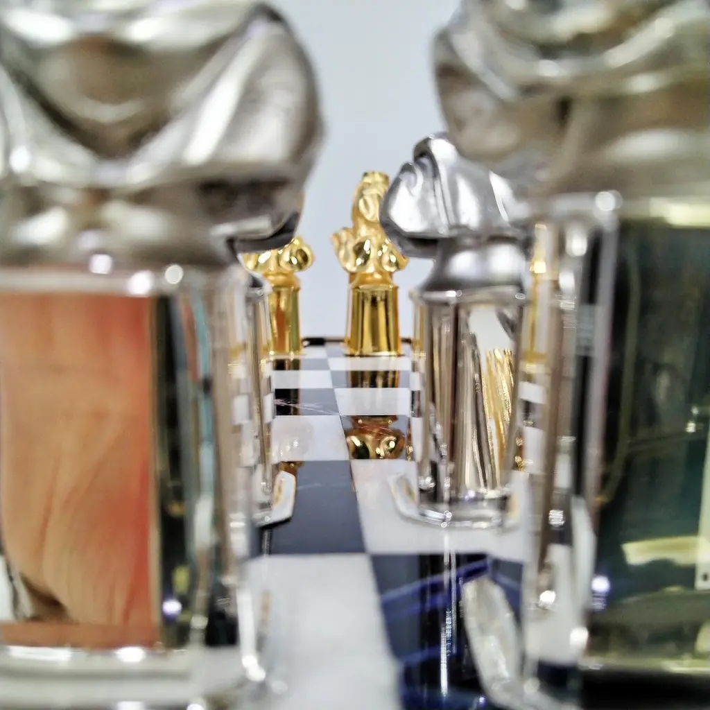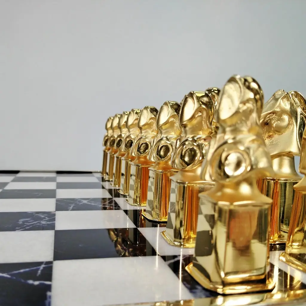Solid sterling silver chessboard with a chess game inspired by the works of sculptor De Chirico. Sodalite top.The chess set features a silver finish for one player, while the other player has a 24kt gold-plated silver finish. To give the pieces movement, the finish on both pieces has been differentiated, with polished and satin parts. The upper part of the chess pieces was cast using a casting technique, while the lower part is made of hand-molded sheet metal, inspired by the paintings of the famous contemporary Italian painter Giorgio De Chirico.The base, also made of solid 925 silver, was shaped and hammered entirely by hand.The chessboard is made of two-tone white and blue sodalite.gr. 5810Made in the second half of the 20th century in the artisanal silversmith workshop of ARVAL ARGENTI VALENZA - Italy