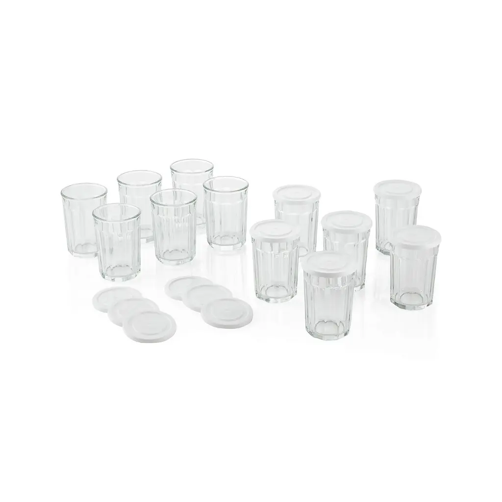 This 12-piece set of our popular Working Glass is perfect for large servings of water, smoothies or shakes with the utilitarian charm of a paneled design and rolled rims. Lids let you store unfinished drinks or prepare special concoctions in advance.