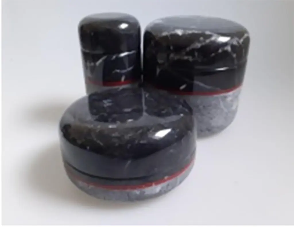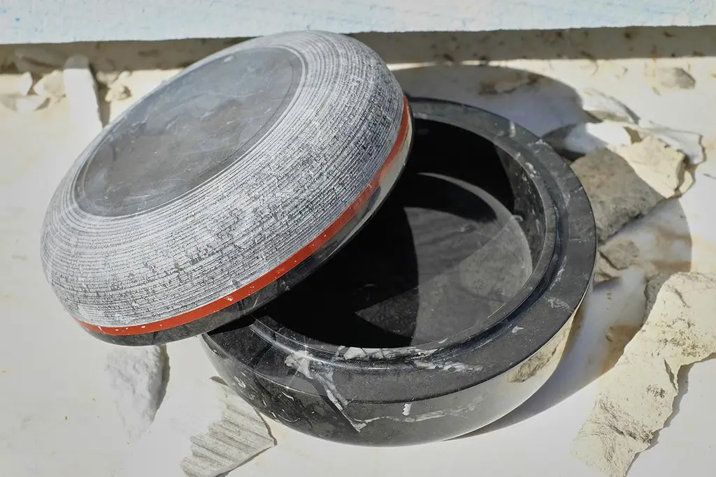 Objects and household itemsSize: Diameter Cm 11 x H 5Materials: Nero MarquinaDesigner: G. Raboni & M.MontefuscoDesigning Pillole, Raboni and Montefusco were fascinated by the way in which marbles reveal themselves according to the type of finish. In Pillole we played with Nero Marquiña marble, contrasting the natural aesthetics of the rough turning with the smooth one of the fine turning. A red colored biological resin mark highlights the junction between the opposites.