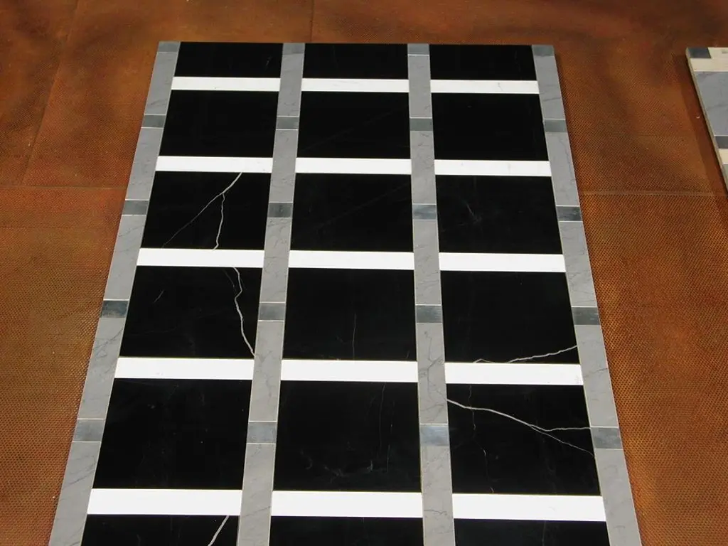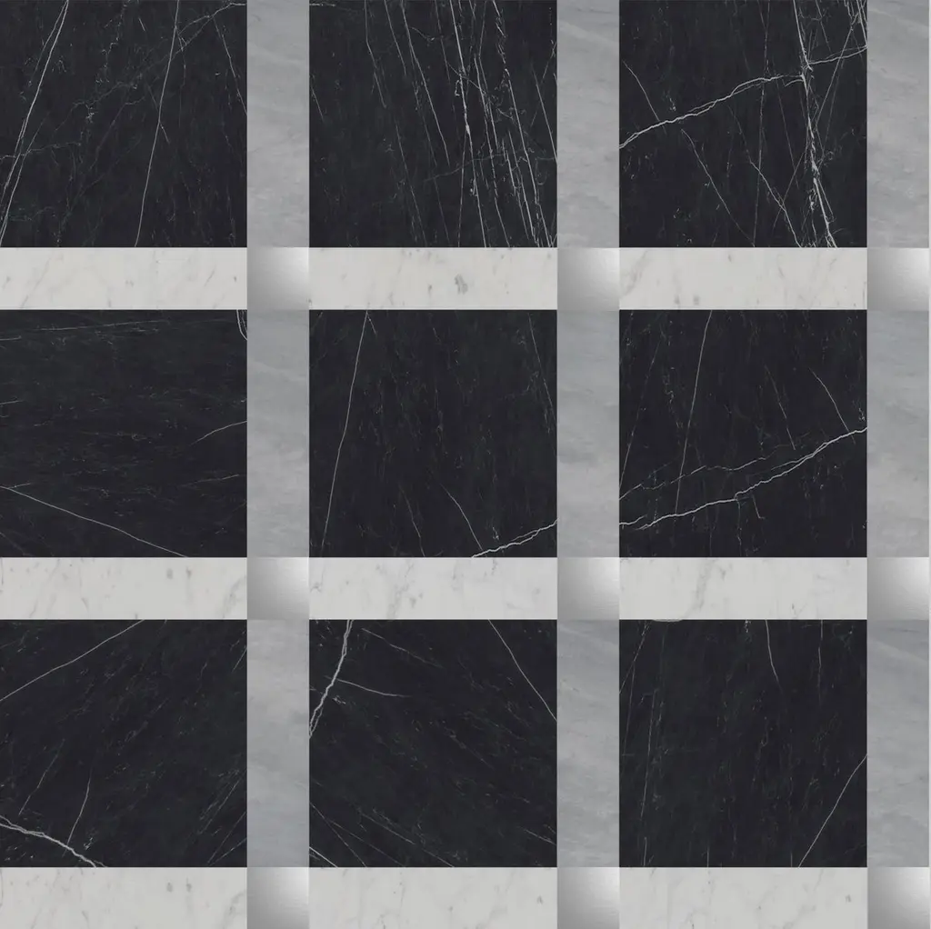 The price is per square meter.Name: A25Materials: Nero up, Bardiglio Imperiale, Bianco up, inoxSize : Cm 40 x 40 Thickness: cm 2KG/MQ: Kg 54Finishes: PolishedDesigned by: Marco Piva.