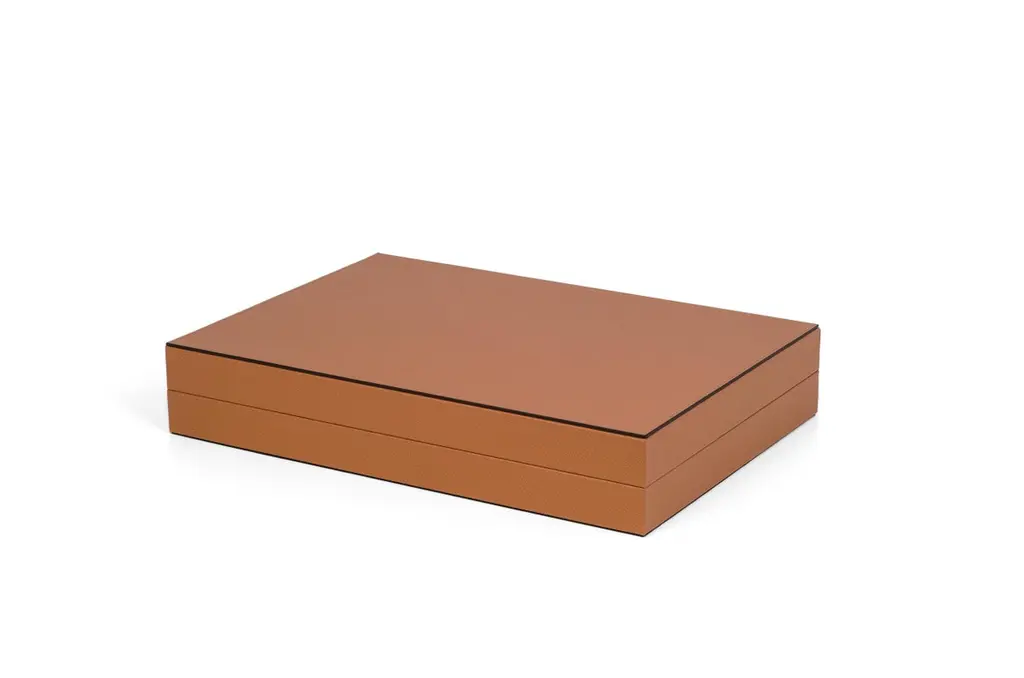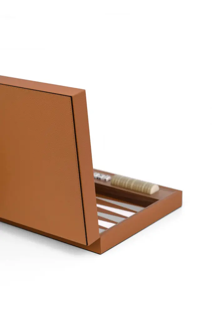 Our backgammon set, a must of board games.Expertly crafted with canaletto walnut wood and dressed on the outside with a textured calfskin leather covering, its interior delivers a colourful twist into a cream background. We can't get enough of these colour combinations.This exceptional set is customizable to suit any taste.