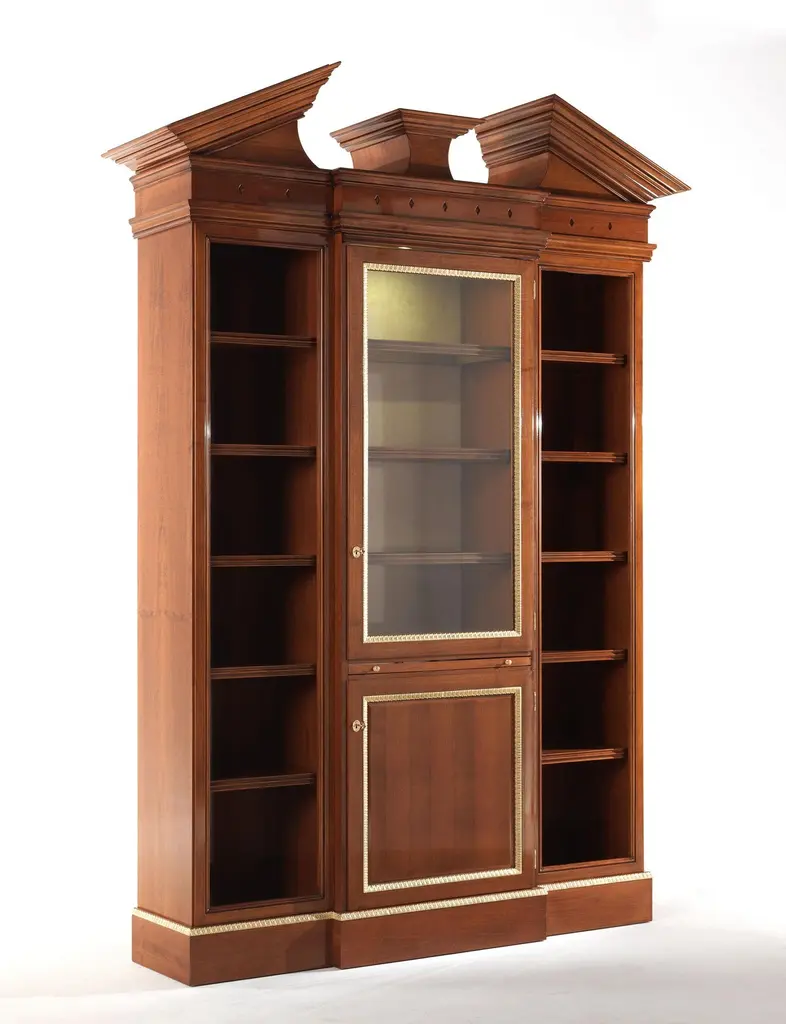 Classic lines and elegant finishes: Etoile showcase is a masterpiece of cabinetmaking. The walnut structure is enriched with natural maple inserts and details with antiqued and patinated gold leaf, adding a refined note to the whole.Etoile showcase with structure in multilayer walnut. Insert in natural maple on the back. Details finished in antique gold with patina JG284.