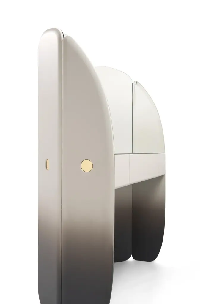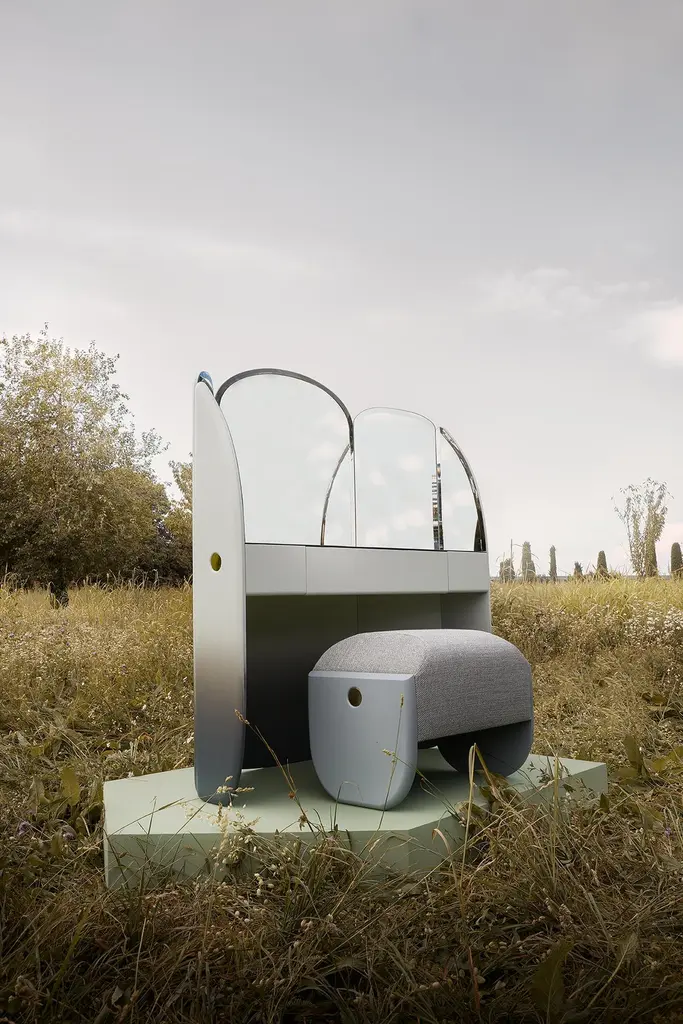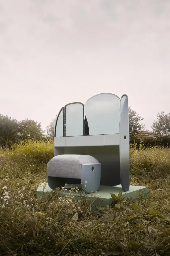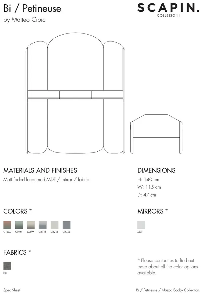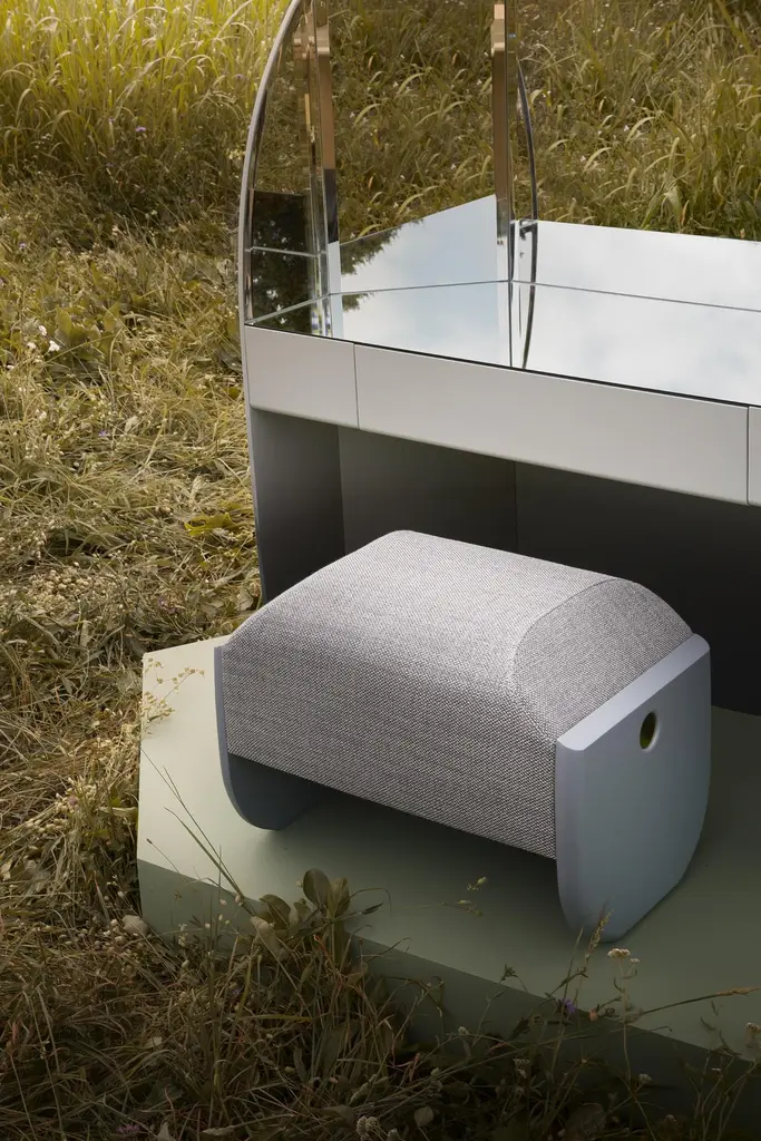 Bi Petineuse, design by Matteo Cibic, product by Scapin CollezioniElegant and sophisticated, BI is a luxury and dreamy petineuse. The gravity of the structure is contrasted by the lightness of the mirrors that lead into an enchanted dimension.Materials: matt faded lacquered MDF, mirror, fabric.Nazca Booby Collection by Matteo CibicWorking with colors and their juxtapositions, Matteo Cibic has created a truly outstanding universe of unique and sophisticated pieces. While designing the collection, he took his inspiration from the slender and faded paws of the Nazca Booby, a particular South American specie of birds. The search for ancient mysteries, shapes and animals coming from remote and mysterious lands, inspired Cibic to create a collection that stands out for the lightness of its elements and for the unique use of faded lacquered surfaces.