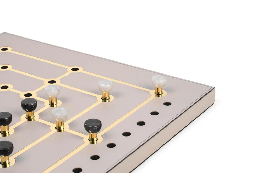 We are glad to welcome aboard our leisure collection the Mill game.This new brilliant strategy board game is crafted with a luxury field covered in soft calf leather embellished by shiny gold details. The gold brilliance and the eco-shell pawns give the timeless allure of the classic game and make it also elegant and perfect to enhance your living spaces.