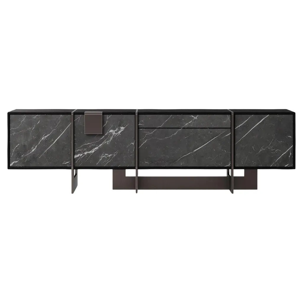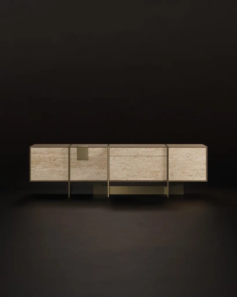 Coloma, in California, is renowned for being the scene where James W. Marshall first found gold in the Sierra Nevada, at Sutter’s Mill in 1848, leading to the California Gold Rush. The polished brass detail embracing the main structure of the Coloma Sideboard reflects our inspiration in the Gold Rush and consequently Coloma, where all this story started. The structure of this stunning piece features three American wood drawers, combined with two grey Kenzo marble doors. Inside the modern Coloma Sideboard, the smoked glass shelves contrast with the wood structure. The top of the modern Coloma Sideboard is supported by American wood and polished brass feet, turning the Coloma Sideboard into a mesmerizing contemporary furniture piece to any luxurious space. Coloma Sideboard was designed by Porustudio and is part of the Casegoods Collection.