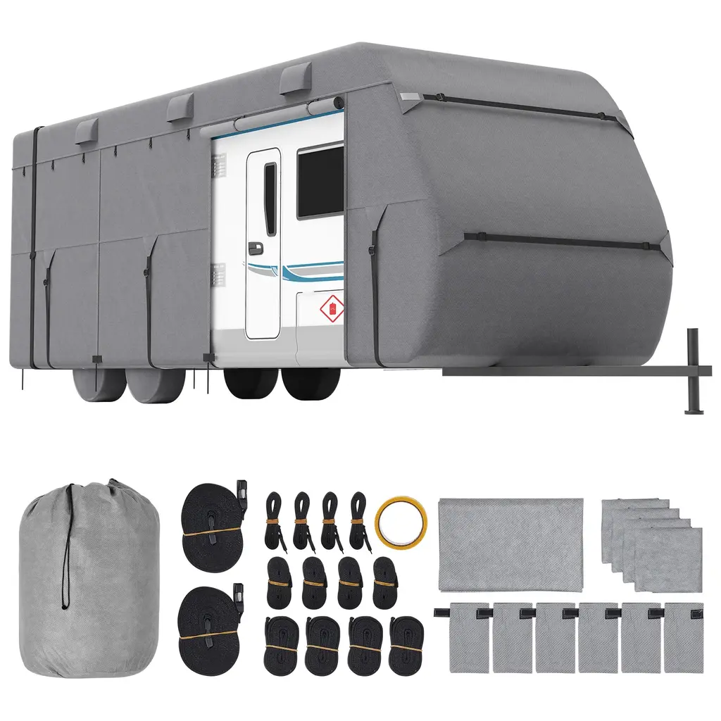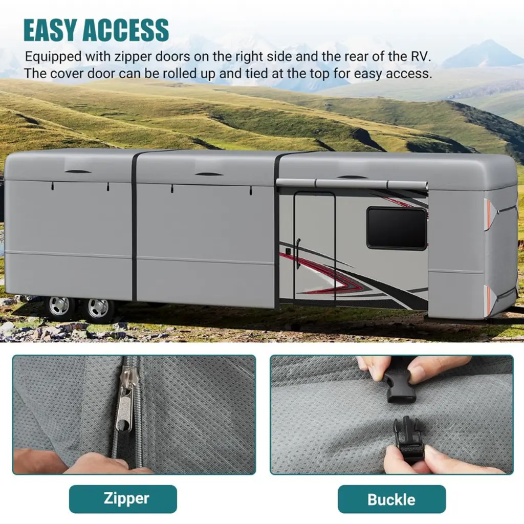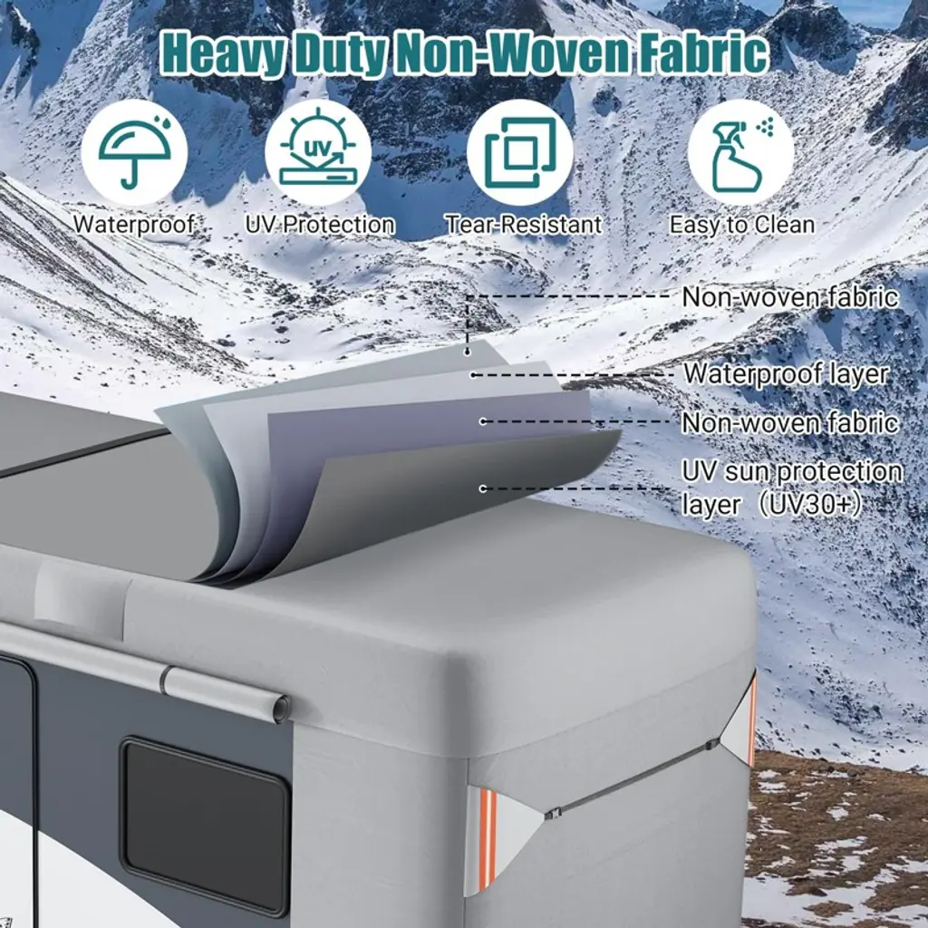 TruAIR RV Cover 22-24ft Heavy Duty Camper Cover - Waterproof, Windproof with Gutter & Tire Covers (Grey)Product Details & Key Features:Superior Weather ProtectionMade of durable non-woven material (300"L x 103"W x 104"H) for complete coverage of 22-24ft RVsWater-resistant, UV-proof and windproof design protects against rain, snow, dust and scratchesPrevents premature aging of your RV's exterior surfacesAdvanced Windproof SystemFeatures elastic hem for snug fit and 10 reinforced straps (2 center + 8 front/back)6 ventilation ports reduce wind pressure and prevent moisture buildupEnsures secure coverage even in harsh weather conditionsConvenient Access PointsZippered doors on right side and rear for easy RV accessDoors can be rolled up and tied when not in useReflective strips enhance nighttime visibility and safetyComplete Protection PackageIncludes tire covers, gutter covers, repair patches and storage bagComes with detailed instruction manual for easy installationAll necessary accessories included for full protectionPerfect Custom FitSpecifically designed for 22-24ft recreational vehiclesVehicle-specific fit ensures optimal coverage and protectionDurable construction for all-season use
