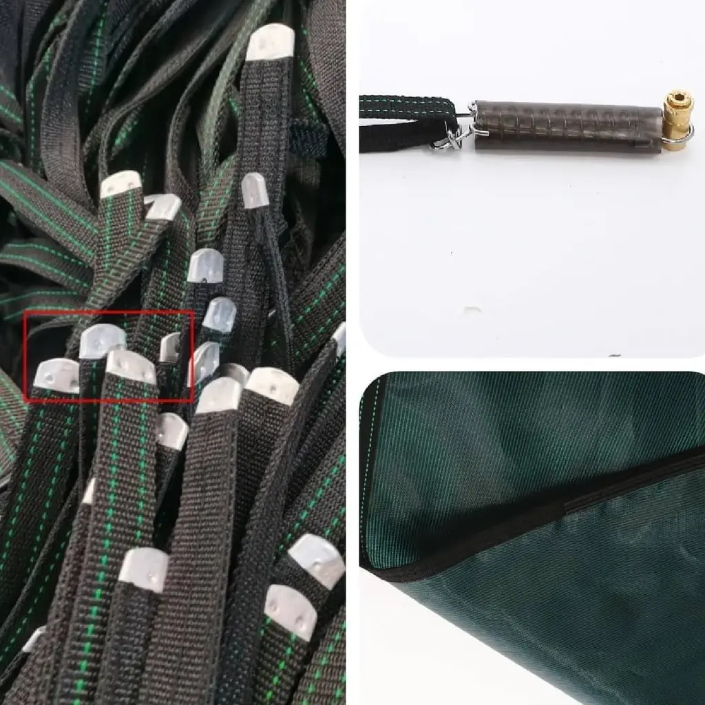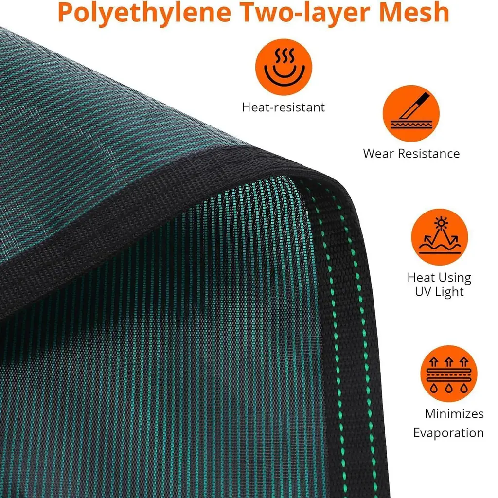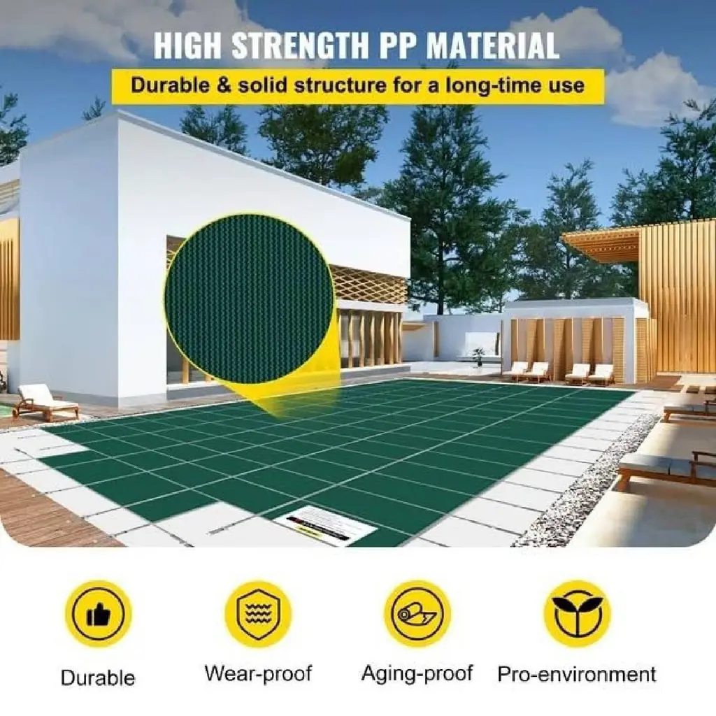 Density PP Material: We use ultra-high density polypropylene material and stainless steel fittings, which are fixed by brass ground spikes to keep the pool safety cover firmly on the pool to protect your family's safety. The durable material is able to withstand various weather conditions without requiring frequent replacement and maintenance.For Longer Use: the ends of the webbing used to hold the cover in place are crimped with metal to prevent the webbing from unraveling; adhesive strips are added to the bottom of the webbing that comes into contact with the ground around the pool cover to prevent long-term wear and tear.A Reliable & Durable Pool Cover: the pool safety cover is different from ordinary plastic safety covers floating on the water surface; it can securely cover the pool using ground nails, effectively preventing debris and keeping the pool water clean, while also preventing pets and children from accidentally entering, reducing potential safety hazards.400LBS Gravity Resistance: Our pool cover can withstand temperatures as low as -10 degrees Fahrenheit (-23 degrees Celsius), so you don't have to worry about using it in any area. A properly installed pool cover can withstand a minimum weight of 400 pounds, fully capable of withstanding snow, debris, gravel, pets and childrenAbout Installation : This pool cover measures: 22*42ft with center steps Suitable for pool size20*40ft. Choose the size of the cover according to the size of your pool, make it 2ft more on each side so that it can cover your pool completely. This pool safety cover is designed to be solid with no gaps or loose ends. In summer you can remove the safety net and easily fold it for storage.