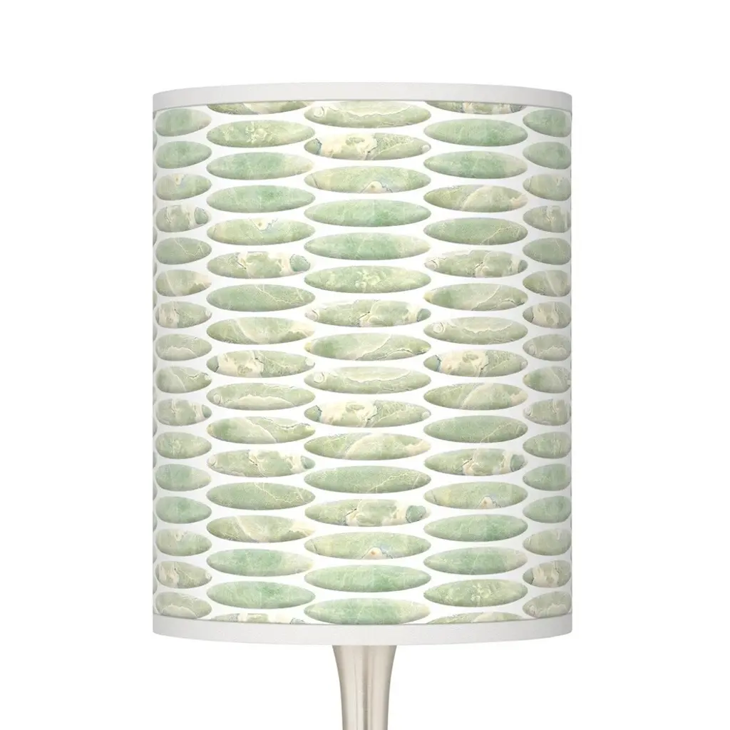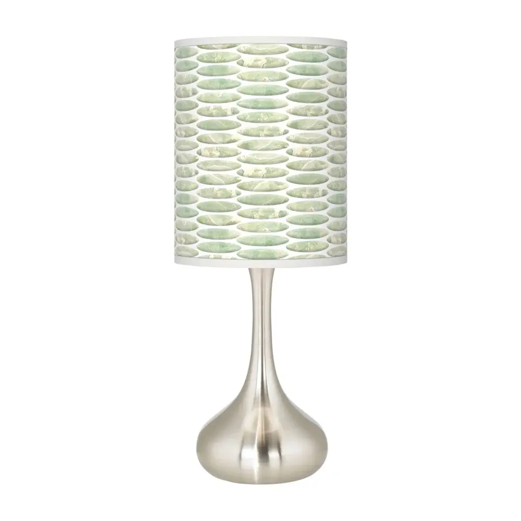 PRODUCT DETAILS: 23 1/2" high overall. Base is 7 1/2" wide. Shade is 11 3/4" high x 9 1/2" wide. Uses one maximum 100 watt standard-medium base bulb (not included). In-line on-off switch on the cord. Droplet modern table lamp with a shade with an exclusive pattern. Custom-printed, made-to-order Oval Tempo pattern giclee shade. Bright, organic green color. Uno style shade fitter. Brushed nickel lamp base finish. Metal construction. 8-foot long cord.