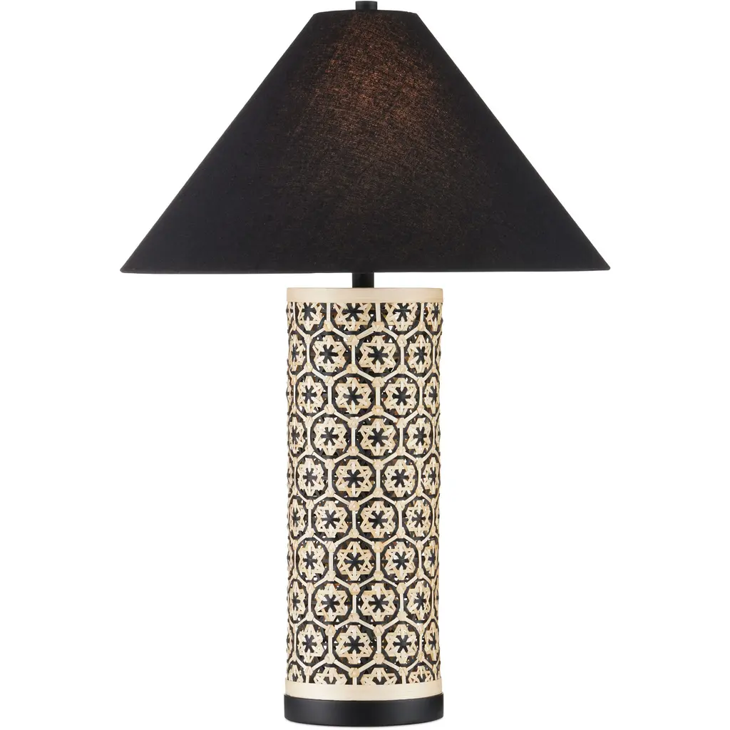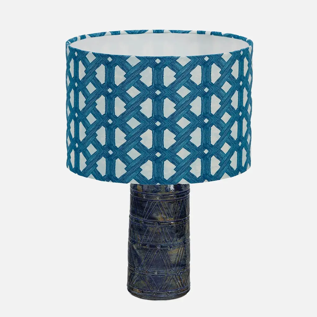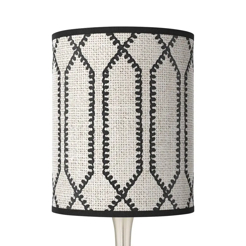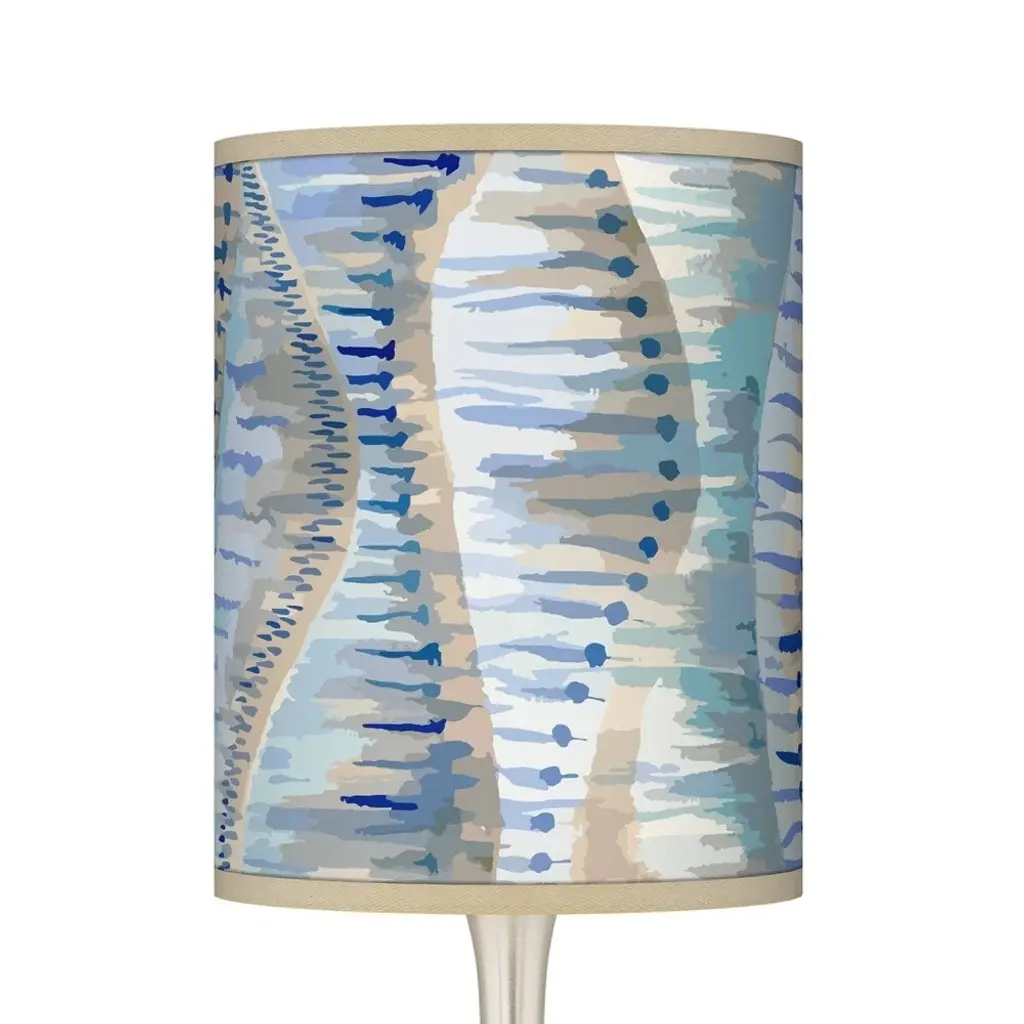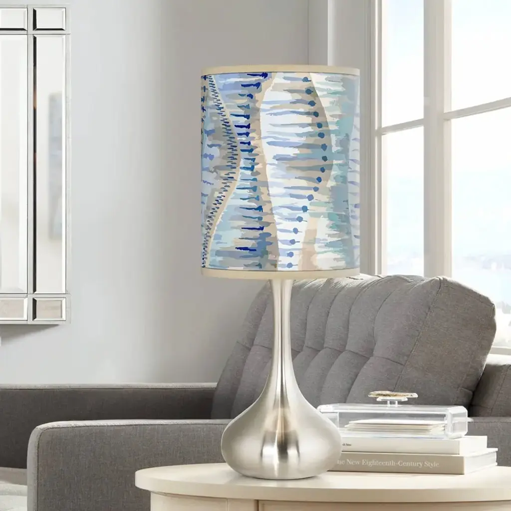 PRODUCT DETAILS: 23 1/2" high overall. Base is 7 1/2" wide. Shade is 11 3/4" high x 9 1/2" wide. Uses one maximum 100 watt standard-medium base bulb (not included). In-line on-off switch on the cord. Droplet modern table lamp. Brushed nickel lamp base finish. Metal construction. Custom-printed, made-to-order Siren pattern giclee shade. A wonderful pattern for modern or coastal style rooms. Uno style shade fitter. 8-foot long cord.