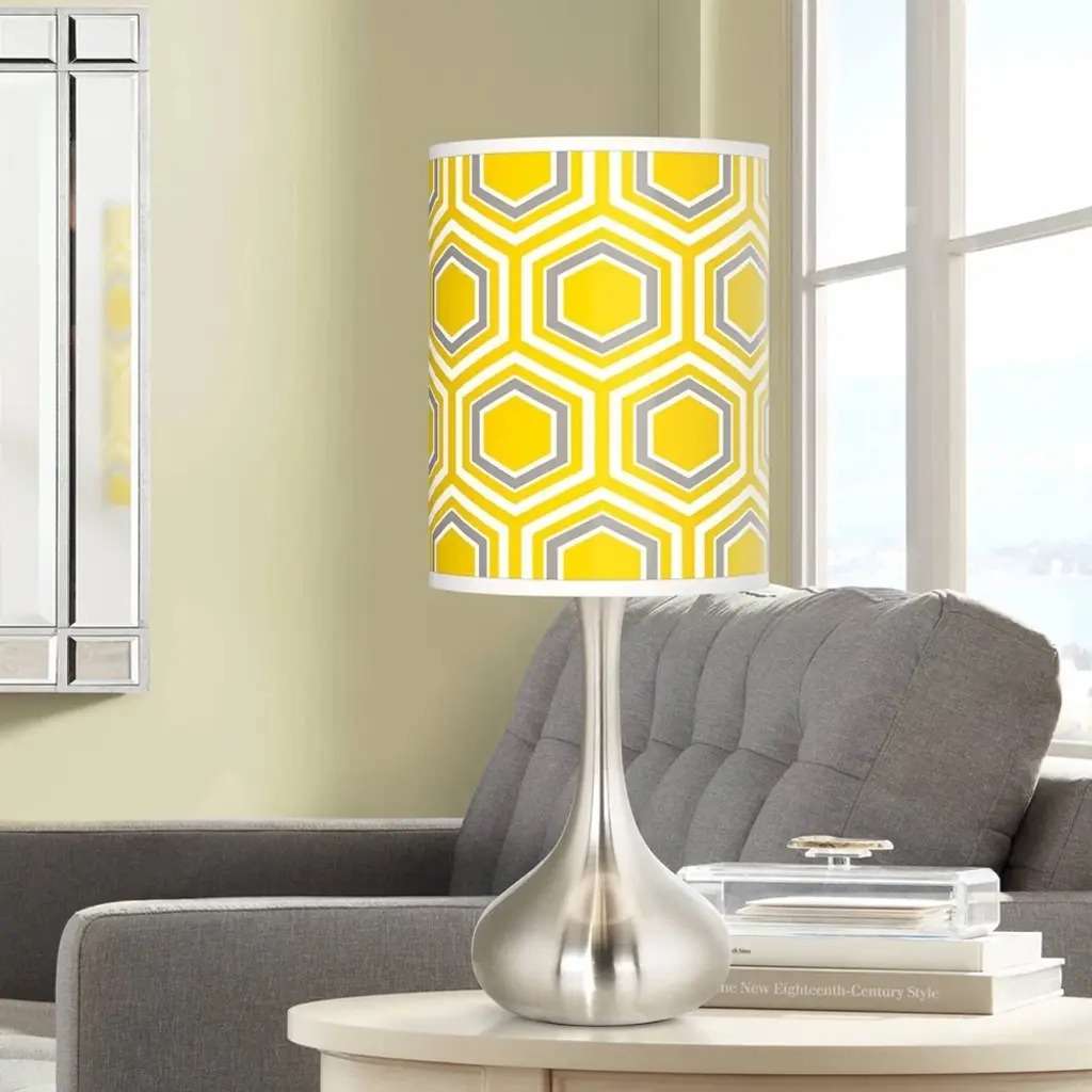 PRODUCT DETAILS: 23 1/2" high overall. Base is 7 1/2" wide. Shade is 11 3/4" high x 9 1/2" wide. Uses one maximum 100 watt standard-medium base bulb (not included). In-line on-off switch on the cord. Custom-printed, made-to-order Yellow Honeycomb geometric pattern giclee shade. Uno style shade fitter. 8-foot long cord.
