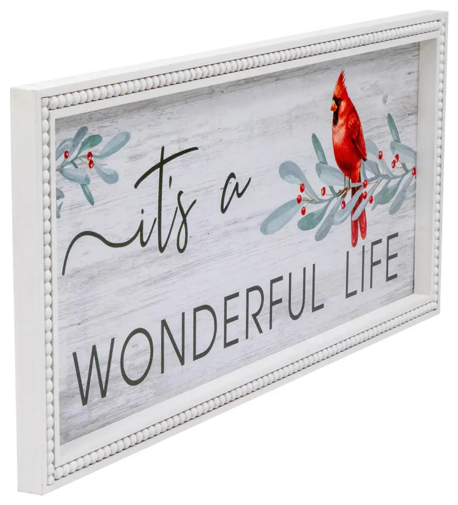This exquisite piece embodies the sentiment of joy and gratitude reminding us to cherish life''s simple pleasures.This white sign reads ''It''s a Wonderful Life'' with a beautiful cardinal. Hang it on your wall as a daily reminder of the beauty in every moment. With its timeless message and tasteful design this wall art serves as both decor and inspiration. Product Features: Framed Christmas wall art Sign reads ''It''s a Wonderful Life'' A wintery scene with a cardinal on a branch Sawtooth hanger on back for hanging Sign can be placed on a flat surface For indoor use only Dimensions: 10"H x 23.5"W x .75"D Material(s): wood