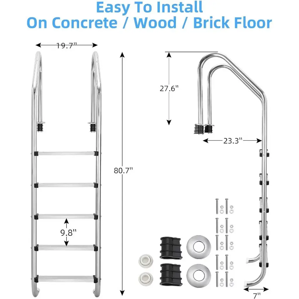 Upgrade your in-ground pool with this premium stainless steel pool ladder, available in 2, 3, 4, or 5-step configurations. Constructed from corrosion-resistant 304 stainless steel, it ensures durability and long-term performance even in chlorinated or saltwater environments. The anti-slip treads offer safe, confident footing, while the ergonomic curved design and easy bolt-on installation make it ideal for both home and commercial pool settings.