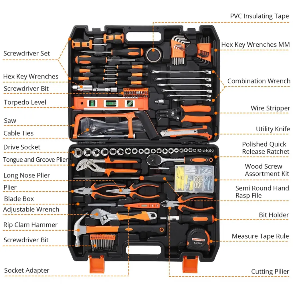The 236-piece basic tool kit includes a Wrench Set, Metric Socket Set, Screwdriver Set, Screw Kit, Measuring Tools, and more. It’s ideal for handymen, repairmen, construction workers, mechanics, car repair technicians, and homeowners. This home tool kit also makes an excellent gift for family, friends, and partners.