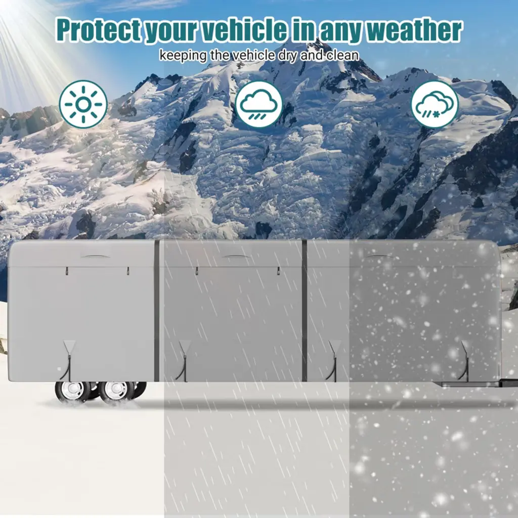 "TruAIR RV Cover 24-27ft Heavy Duty Waterproof Camper Cover ¨C Windproof, UV-Resistant with Gutter & Tire Covers, Reflective Strips (Grey)"Product Details & Key Features:Premium ProtectionMade of upgraded non-woven material (336"L x 106"W x 108"H) for full exterior coverage of 24-27ft RVs.Water-resistant, windproof, UV-resistant, and dustproof¡ªprotects against rain, snow, cracks, and scratches to prevent premature aging.Enhanced Windproof DesignFeatures an elastic hem for snug fit and 10 reinforced straps (2 middle + 8 front/back) for secure anchoring.Includes 6 ventilation ports to reduce wind pressure and evaporate moisture, preventing condensation.Convenient Access & SafetyZippered doors on the right side and rear for easy RV entry; doors can be rolled up and tied.Reflective strips on the front improve nighttime visibility and collision prevention.Complete AccessoriesIncludes tire covers, gutter covers, patches, windbreaks, storage bag, and manual for hassle-free installation.Durable & Vehicle-Specific FitDesigned for recreational vehicles with all-season protection; ensures a custom fit for 24-27ft RVs.