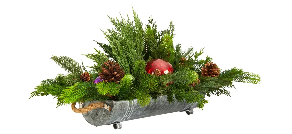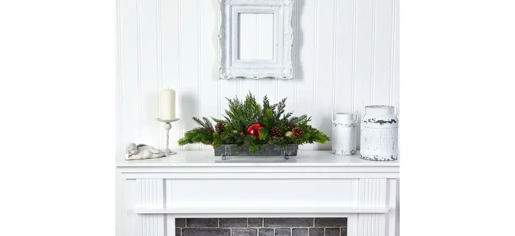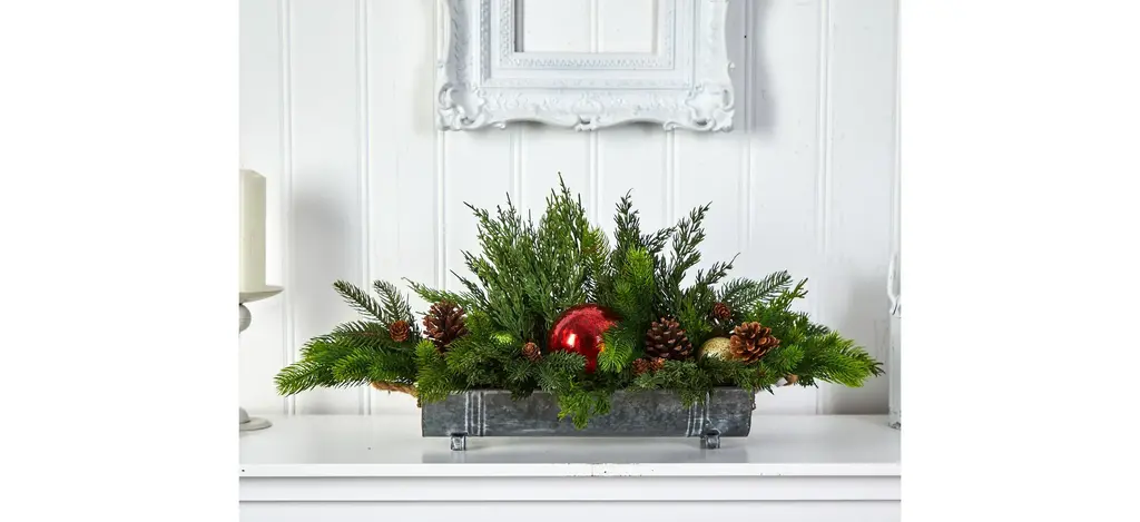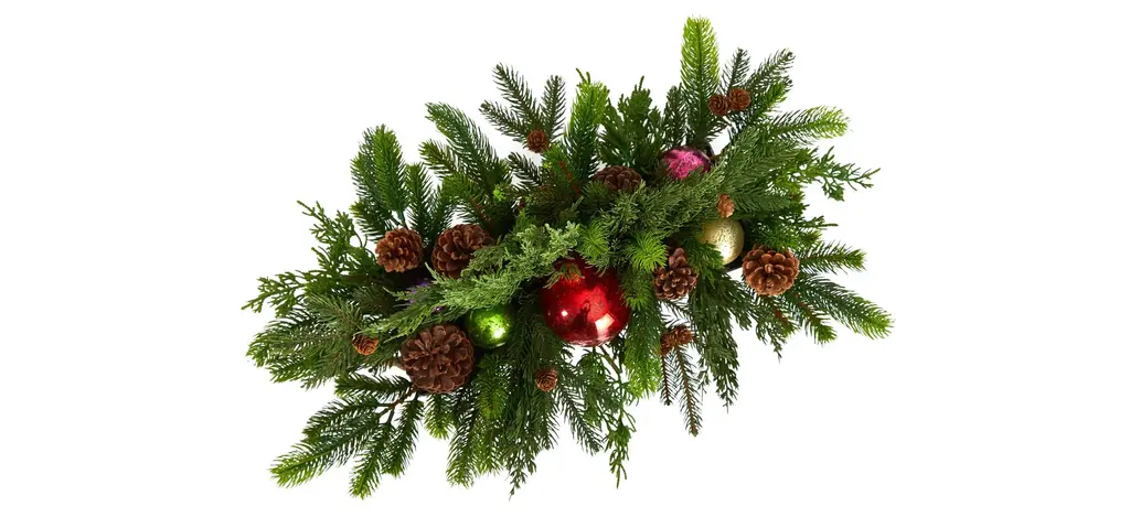 Set the scene during the holidays with the 24" Cedar Pine, Pinecones and Ornaments Artificial Arrangement in Tin Vase. Handcrafted by stylists and inspired by nature, realistic-looking cedar is accented by pinecones and glossy ornaments for a bit of holiday cheer. With a length of 24" and housed in a decorative vase, house in any table that needs a Christmas touch. House in a mantel, dinner table or foyer.