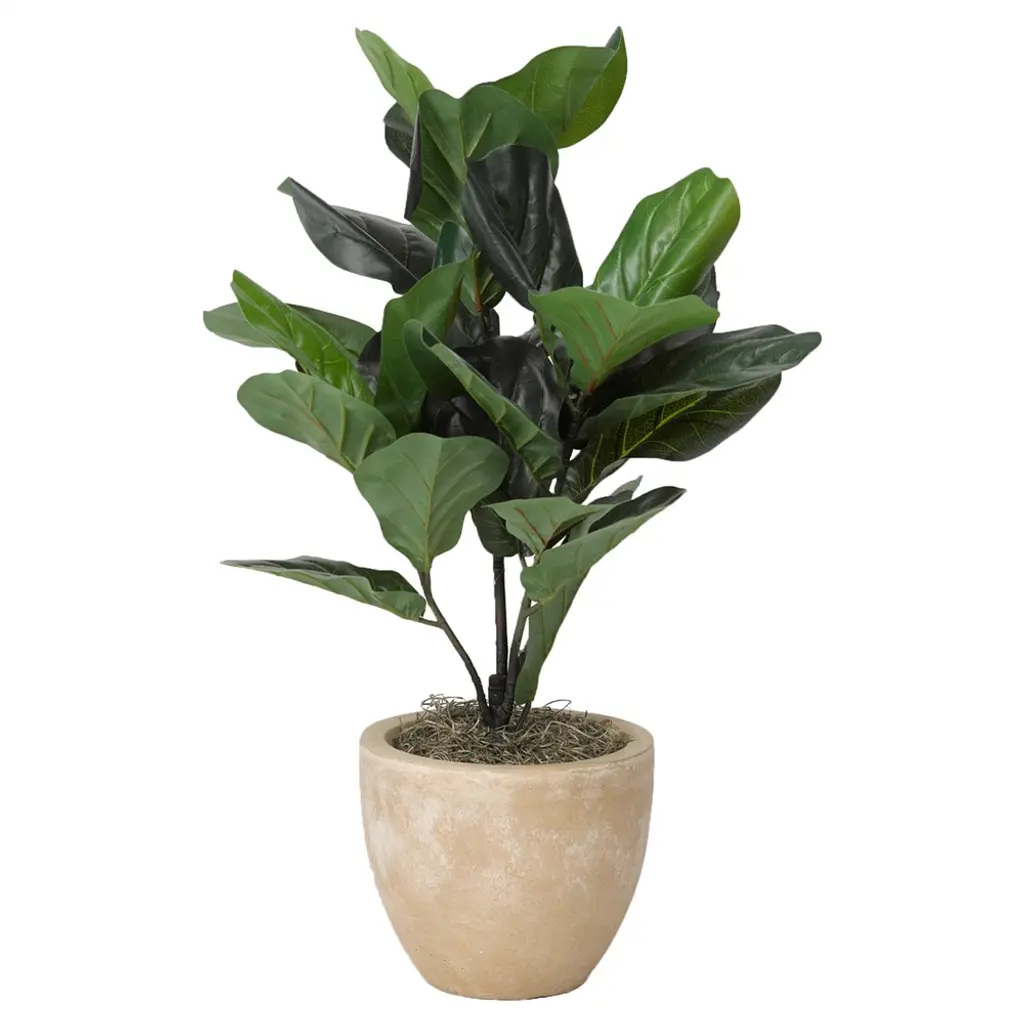 24" Fiddle Leaf Fig Tree In Distressed Clay Pot. Brighten your home with the 24-Inch Fiddle Leaf Fig Tree in a Distressed Clay Pot. Its lush, broad leaves offer a pop of vibrant green and a modern touch. The distressed clay pot adds rustic character for a stylish, maintenance-free accent. Matching pieces sold separately. Fully assembled. Manufacturer: K&K Interiors.