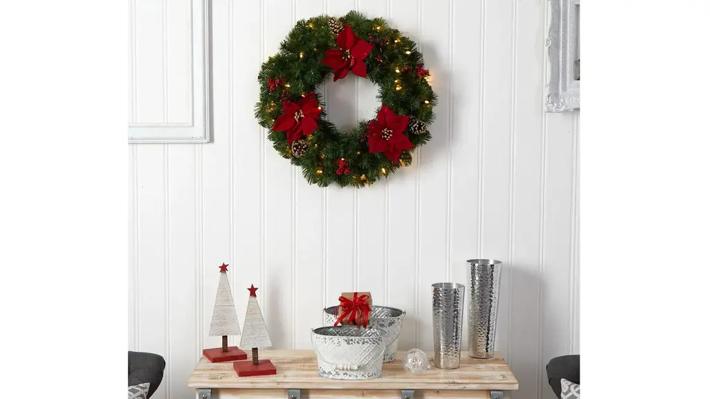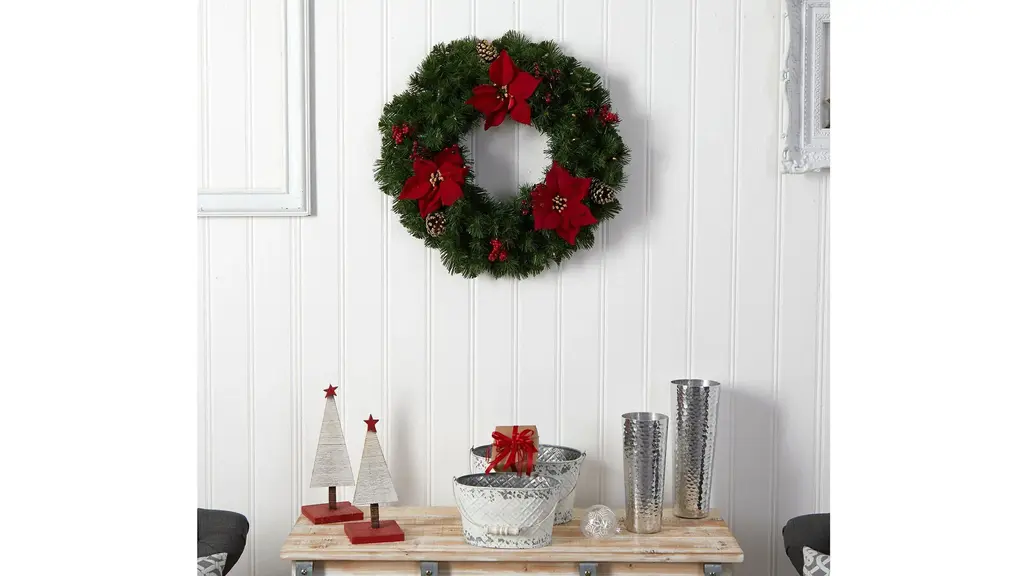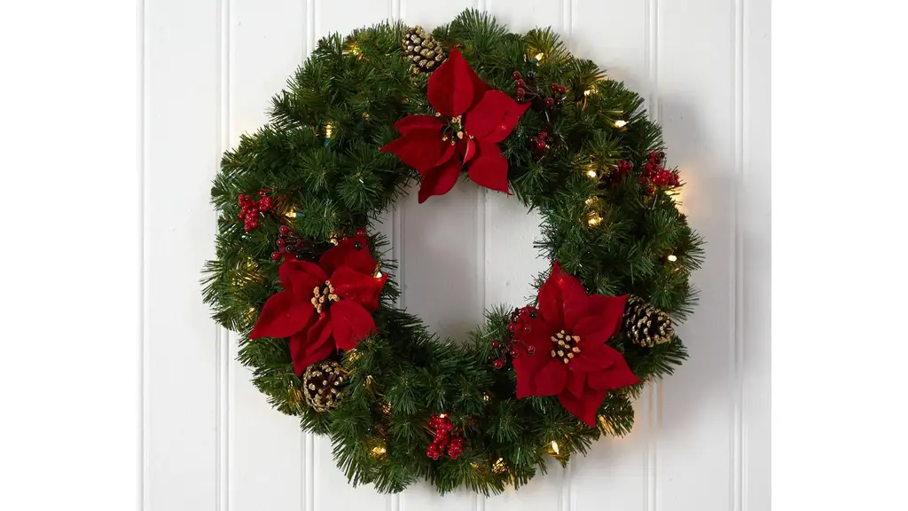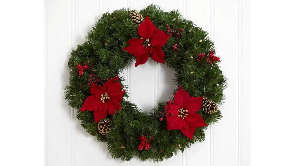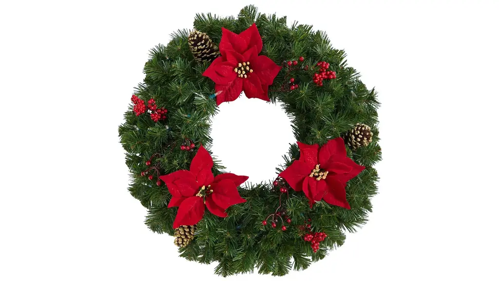 Light up your favorite seasonal accents while adding serious curb-side appeal with this artificial 24" Holiday Foliage Artificial Wreath with Warm White LED Lights. Intricately designed from realistic looking pine foliage in a palette of seasonal evergreens, carefully accented throughout with faux pinecones, berries and Poinsettias that look incredibly realistic. Arriving pre-strung with 50 LED lights to effortlessly illuminate either a wall or door, this 24" diameter wreath makes for an inviting accent and will undoubtedly transform any entrance all throughout the holiday season. Your wreath will look beautiful for years to come; simply wipe clean with a soft dry cloth when needed.