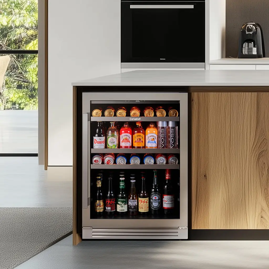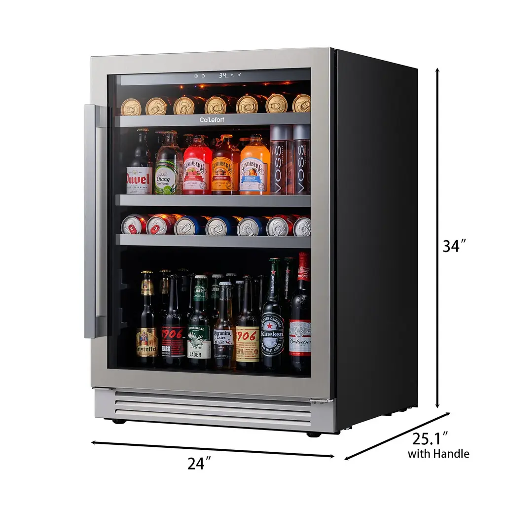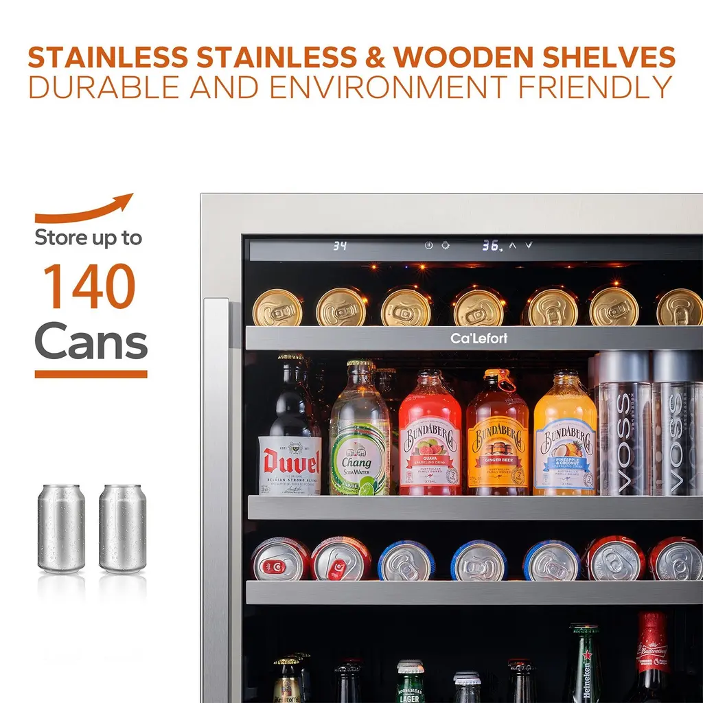 Keep your beverages perfectly chilled and easily accessible with this sleek 24-inch beverage cooler. With a temperature range of 34-54°F, this fridge accommodates up to 140 standard 12oz cans and features 3 customizable LED lighting colors (blue, white, amber). Its stainless steel, fingerprint-resistant glass door and hidden hinges ensure a stylish, modern look for any home or office. Whether freestanding or built-in, this cooler is designed to fit seamlessly into your space while maintaining an optimal internal environment with auto-defrost and activated carbon odor filter features. Perfect for any beverage enthusiast! Features: