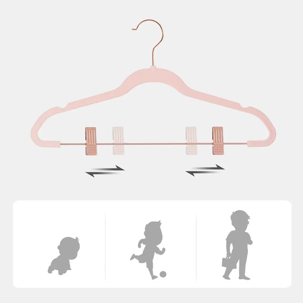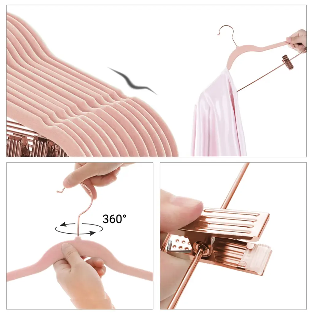 These slim velvet hangers feature rose gold hooks and movable clips with non-slip pads to securely hold various garments without slipping. The adjustable clips (up to 15.6") and velvet surface provide a custom fit while protecting clothing. With 360° swivel hooks and a space-saving 0.2" profile, this set of 24 hangers helps organize pants, skirts, and dresses efficiently. Size of Each Hanger: 16.7"W x 9.3"H (42.5 x 23.5 cm) Total Weight of 24 Hangers: 6 lb (2.7 kg) Max. Static Load Capacity of Each Hanger: 5.5 lb (2.5 kg)