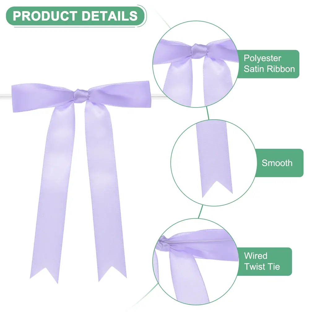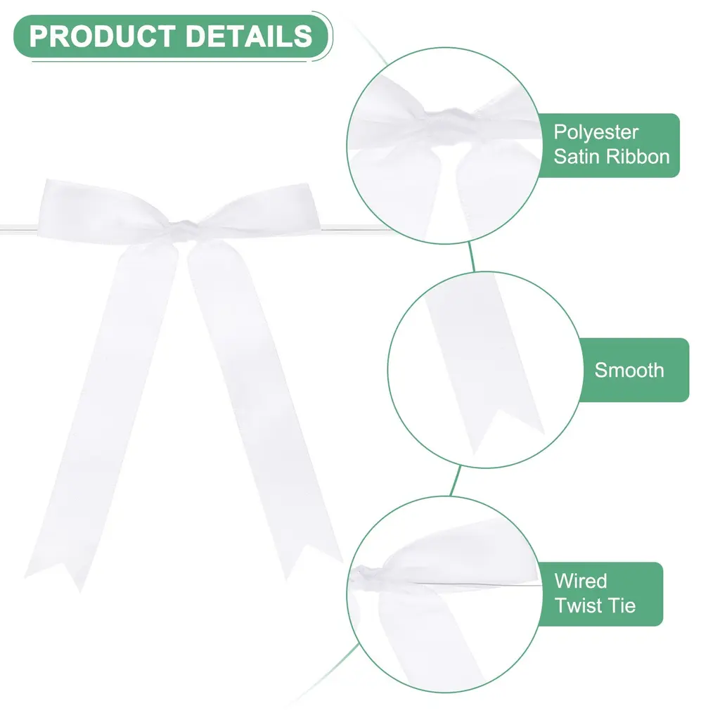 PRODUCT APPLICATIONSOur ribbon bows and twist ties have various applications. They can be used in the hemming and decoration of handcrafts, gift bags, bakery candy bags, present bags and box decorations, bags, sleeping bags, tents, and clothing. Because polyester ribbons are soft, they are mostly used for the hemming of softer fabrics.PRODUCT DETAILS & INCLUDE√ Material: Polyester√ Color: Pink√ Overall Size: 17.7x12.7cm/6.97x5 Inch(L*W); Ribbon Width: 2.5cm/0.98 Inch√ Package Includes:24-Pack x Ribbon Bows Twist Tie for Baked GoodsPRODUCT ADVANTAGES1. Crafted from polyester plastic, our craft ribbon bows twist tie appliques offer fine texture, high washing fastness, no fading, smooth and wrinkle-resistant, and flexible to the touch.2. Our satin ribbon bow twist tie features a classic design, the product is bright in color, fashionable and new in design, and can be used on many occasions. It is suitable for hair accessories, clothing, Christmas gifts, baking decorations, gift box packaging, hotel decorations, wedding decorations, flower packaging, birthday arrangements, etc.INSTALLATION1. Choose the color of the Mini Ribbon Bow that matches your project or gift wrapping paper.2. Use twist ties (not included here) or glue to secure the mini ribbon bows twist tie to desired surfaces such as gift boxes, cards, or crafts.3. Adjust the position of the bow if necessary to get the desired look.