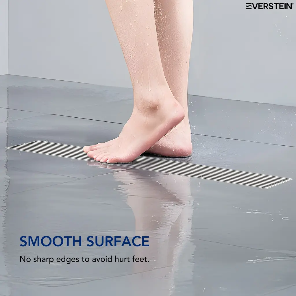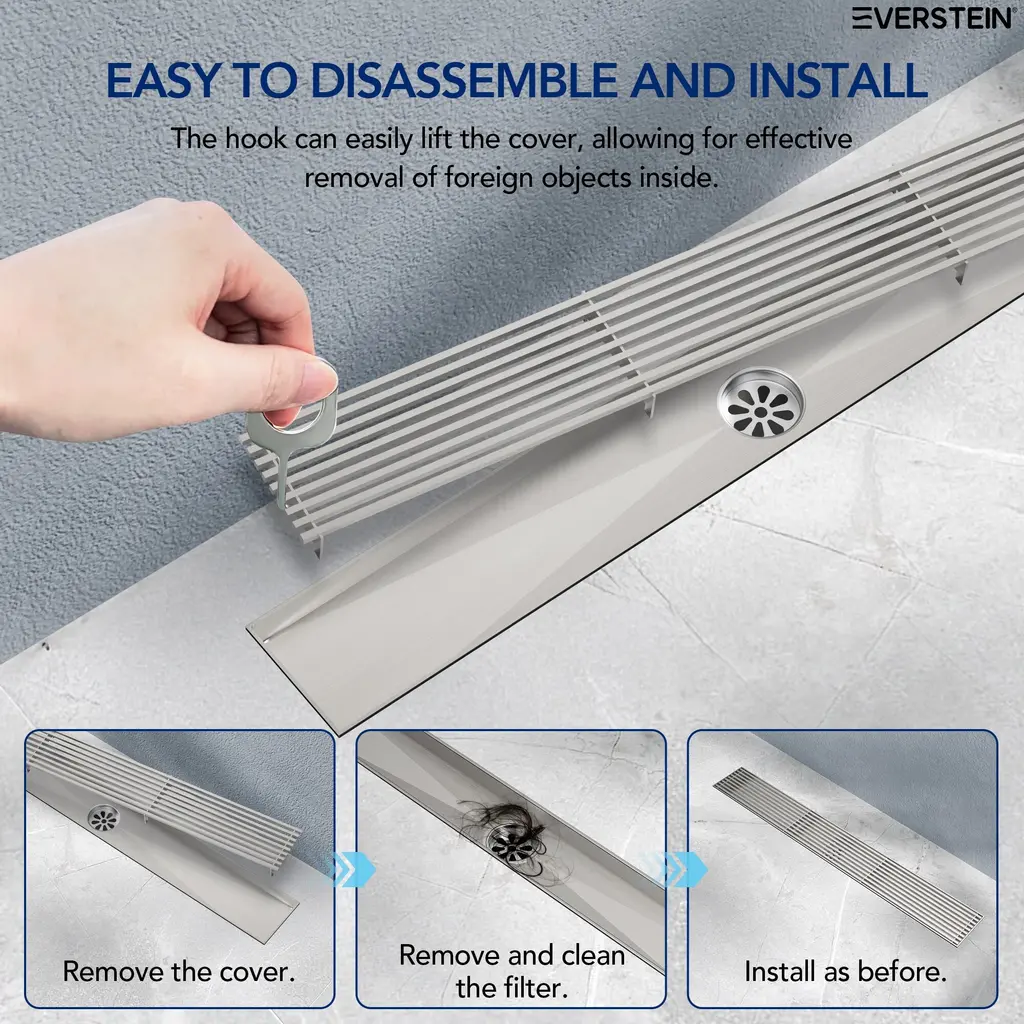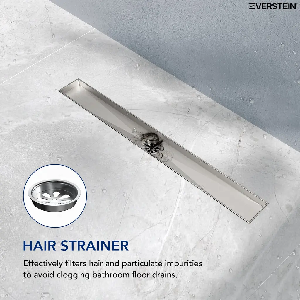 This linear shower drain is designed to deliver efficient water drainage with added features for convenience and durability. Equipped with a built-in hair strainer, it effectively captures debris to prevent clogging, ensuring smooth water flow and reducing maintenance efforts. The diameter of outlet is 2", high displacement with an average of 60 l/min. Ideal for use in bathrooms, showers, kitchens, swimming pools, balconies, garages, basements, toilets, and even outdoor areas, the EVERSTEIN floor drain ensures a smooth and hygienic drainage system for your home or commercial space. Feature:After-Sales Warranty: EVERSTEIN provide a lifetime warranty that covers all issues not resulting from human error or accidental damage, with customer service support, ensuring a seamless and worry-free experience from product selection to installation.