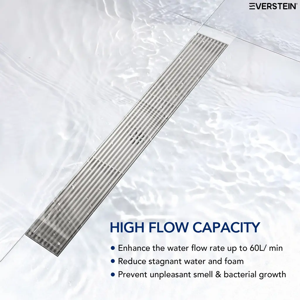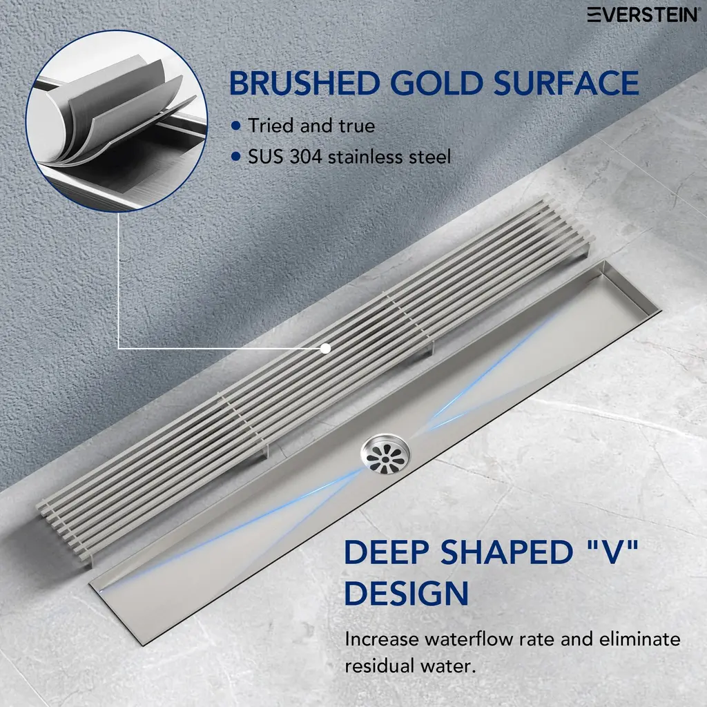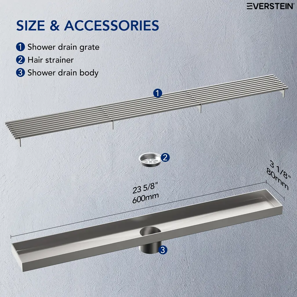 This linear shower drain is designed to deliver efficient water drainage with added features for convenience and durability. Equipped with a built-in hair strainer, it effectively captures debris to prevent clogging, ensuring smooth water flow and reducing maintenance efforts. The diameter of outlet is 2", high displacement with an average of 60 l/min. Ideal for use in bathrooms, showers, kitchens, swimming pools, balconies, garages, basements, toilets, and even outdoor areas, the EVERSTEIN floor drain ensures a smooth and hygienic drainage system for your home or commercial space. Feature:After-Sales Warranty: EVERSTEIN provide a lifetime warranty that covers all issues not resulting from human error or accidental damage, with customer service support, ensuring a seamless and worry-free experience from product selection to installation.