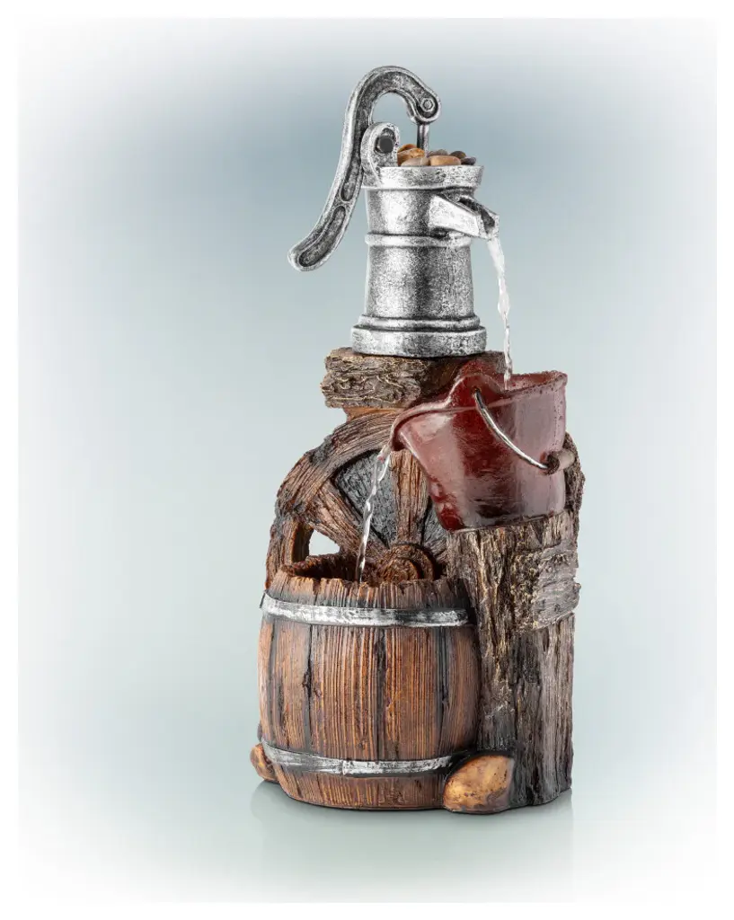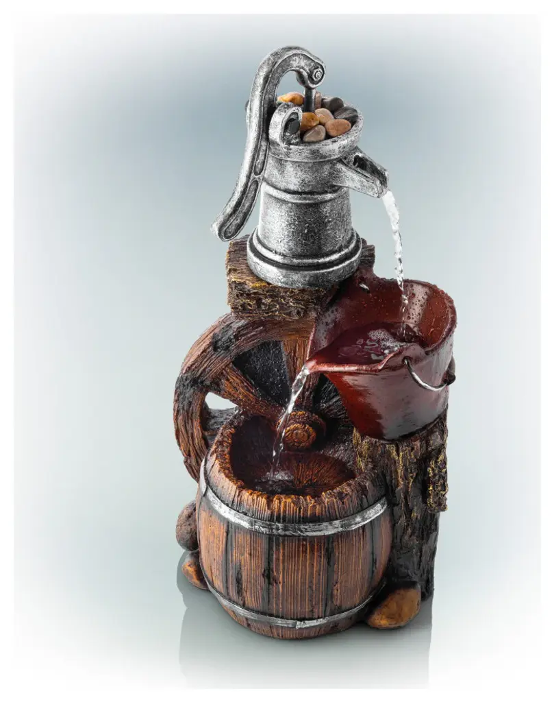 Add a touch of vintage fun to your outdoor space with the Alpine Corporation Old-Fashioned Pump and Barrel Fountain. Enjoy the sound of trickling water that cascades from the pump spout down to the tilted bucket and all the way into the lower barrel. The design adds an old-fashioned, rustic element to your space. This outdoor fountain looks great in your garden, patio, deck, porch, or yard space. The polystone and fiberglass construction is weatherproof, rust-resistant, and durable for years of quality use. The weight of the fountain and sturdy base allow it to stay upright in the strongest wind. To use, simply plug into an outdoor outlet, fill upper level with water, and watch as the interior pump creates a lovely water flow. With a 1-year warranty, you can be confident in the quality of your purchase. Fountain measures 12"L x 9"W x 24"H for use in yards of any size. Alpine Corporation is one of America''s leading designers, importers, and distributors of superior quality home and garden decor products. Alpine Corporation''s award winning in-house design team continuously develops new and innovative "statement pieces" for your home and garden. Your indoor and outdoor living spaces will be the envy of the neighborhood with our wide assortment of fresh, fashionable and contemporary products, from beautifully crafted solar garden stakes featuring patented motion and fiber optic lighting technology to beautiful fountains and delightful bird baths and feeders.