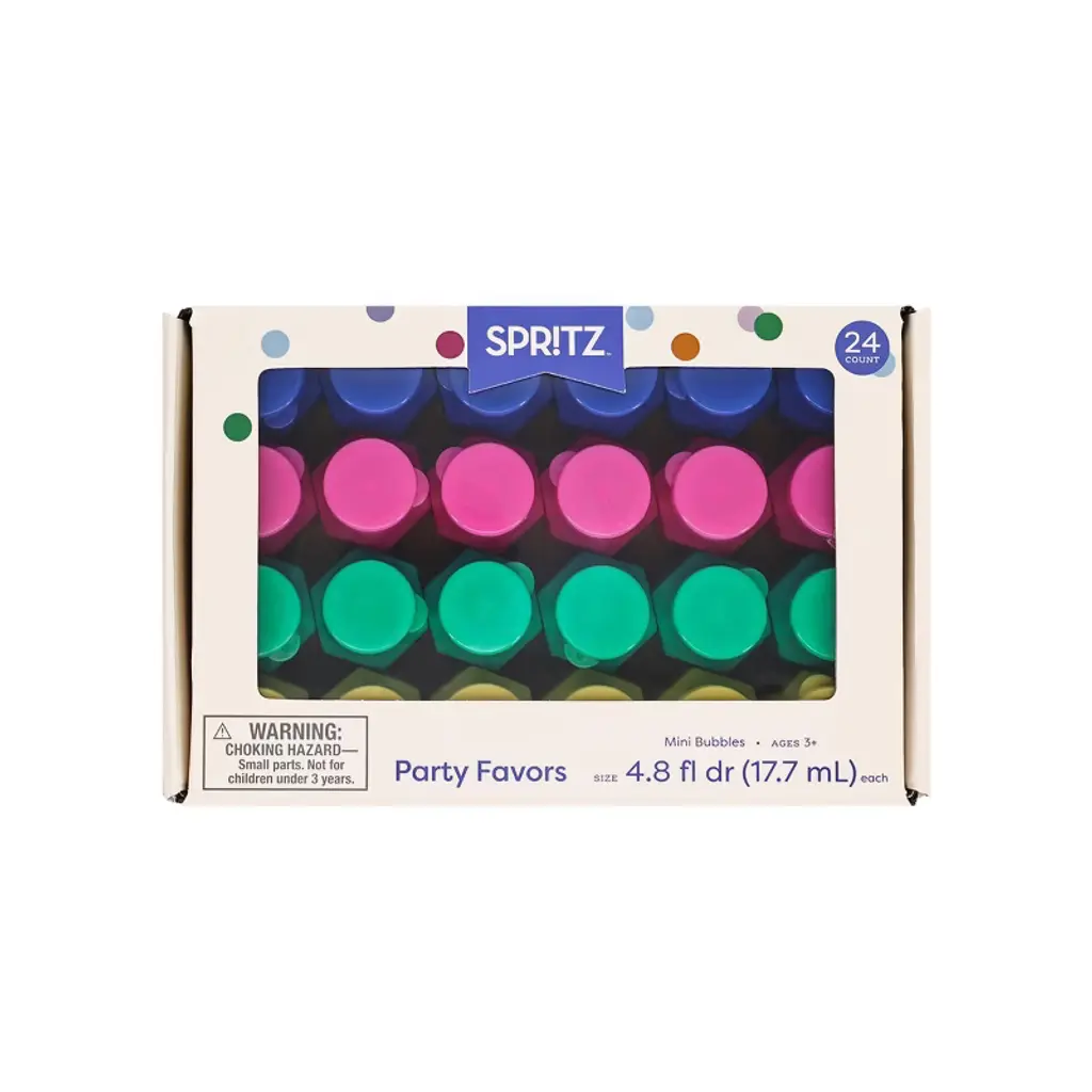This 24-Count of Mini Bubbles from Spritz™ provides kids and adults alike with hours of outdoor fun. This pack comes with 24 mini bubble bottles in a variety of colors for fun flair. These bubble bottles make great party favors for all occasions, and they're suitable for use by kids ages 3 and up.Spritz™: Pops of joy that make the moment™