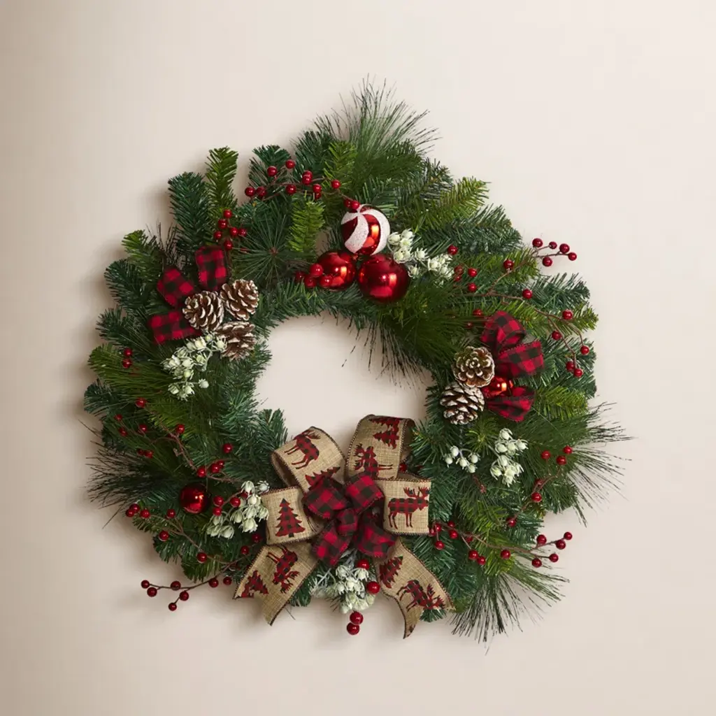 Keep winter-inspired decor accents traditional this year with the help of this artificial wreath. Intricately designed from realistic looking pine foliage, this artificial wreath comes carefully accented with a mix of red and white holly berries, handsomely complemented throughout with decorative ornaments, faux pinecones that look incredibly realistic, and completed with a seasonally-inspired oversized bow, all in order to get you into the holiday spirit. Perfect for wall and/or door display in either a home or office environment, this festive 24" (in circumference) decorative wreath makes for an inviting accent and can undoubtedly help inject front-door appeal all throughout the season.
