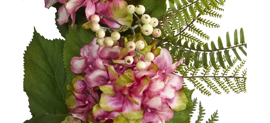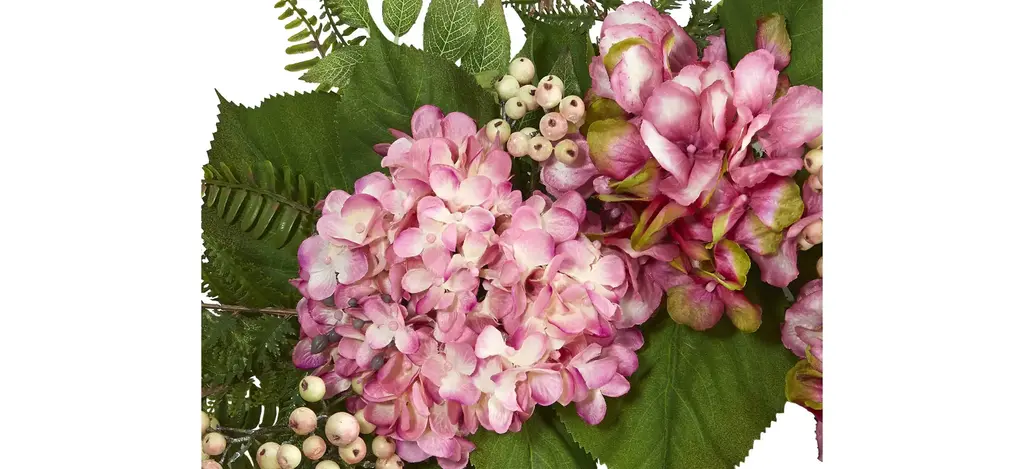 Let the splendor of the outdoors come into your home with this stunning 24 inch Hydrangea Berry Wreath. For a softer feel to your bedroom or front door, add this ornament with its beautiful pink blooms that give off a playful and charming appeal.