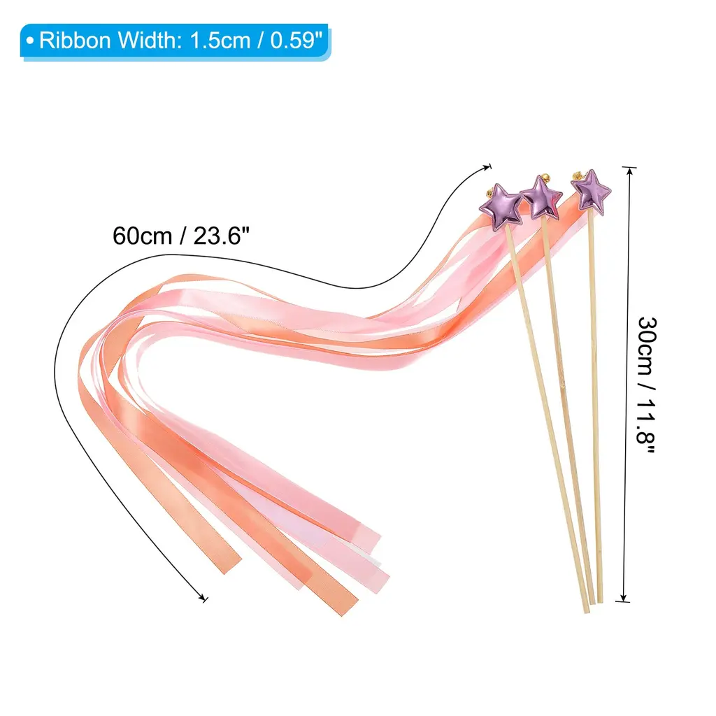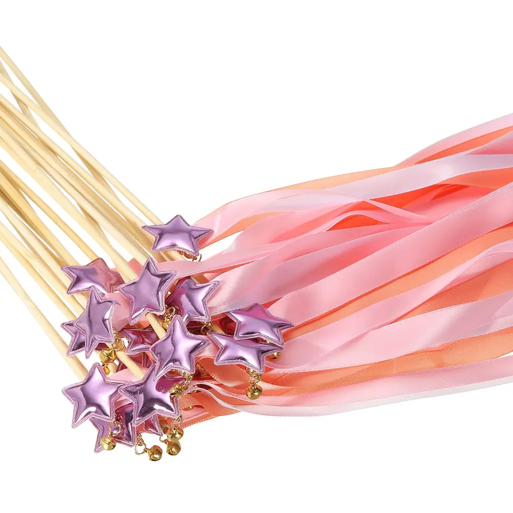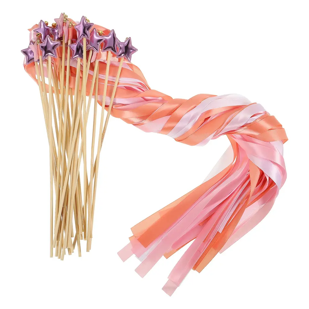 The beautiful and romantic fairy wands can add a magical touch to weddings, bridal showers, send off, birthdays, party favors, other special events; Also a fun accessory for costumes, dress-up play, or cheerful holiday celebrations.Specification Color: Champagne, Pink, WhiteMaterial: Silk Ribbon, WoodRibbon Width: 1.5cm / 0.59 inchRibbon Length: 60cm / 23.62 inchStick Length: 30cm / 11.81 inchPacking List: 24 x Decorative Ribbon Fairy Wands with BellsAdvantageMade of lightweight satin ribbon and star-shaped ornament, a wooden wand handle is comfortable to hold and wave around. The colorful ribbons create an enchanting and playful appearance, the jingle bells add a melodious and joyous sound while waving.InstructionHold the wand by the handle, ensuring a secure grip. Wave the wand gently in the air to create flowing movements with the ribbons.NOTEKeep them away from open flame or heat sources to prevent damage. Ensure that the ribbons are securely attached to the wand to avoid potential harm.
