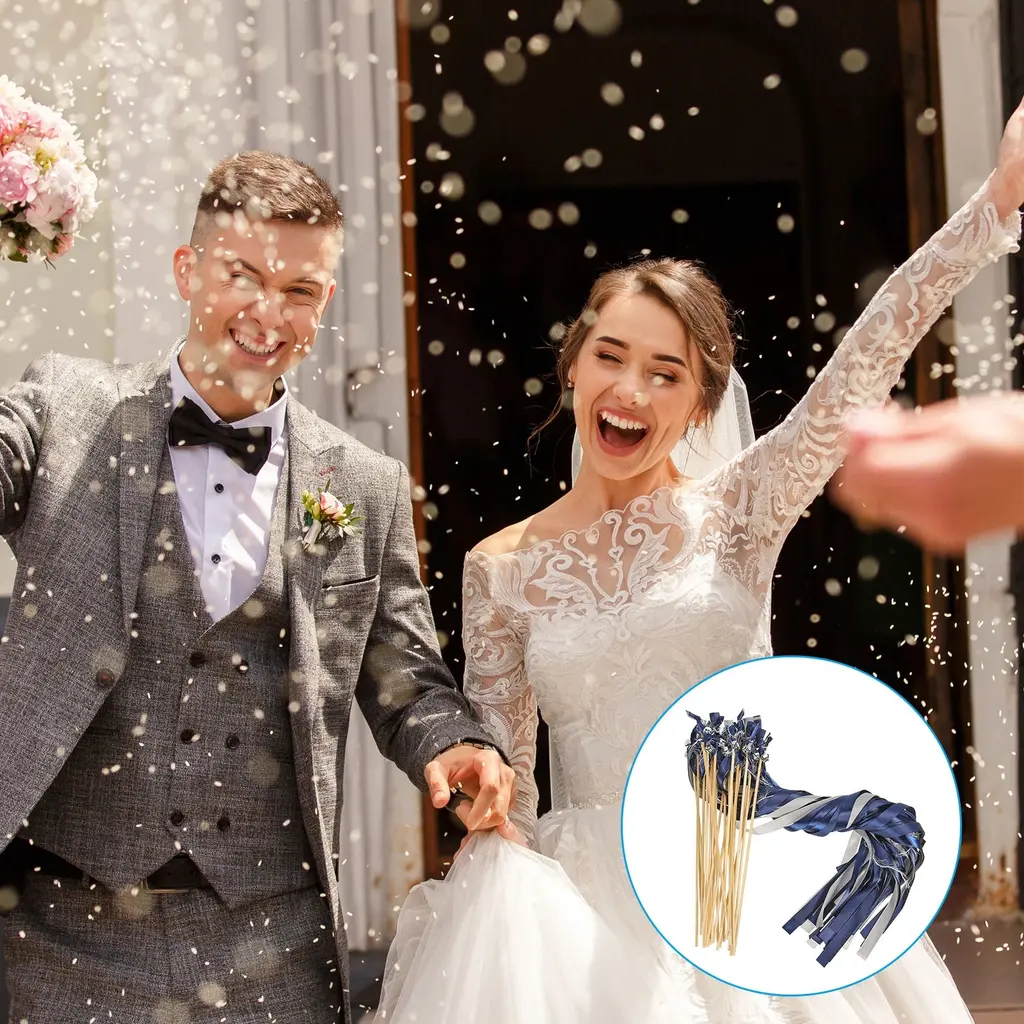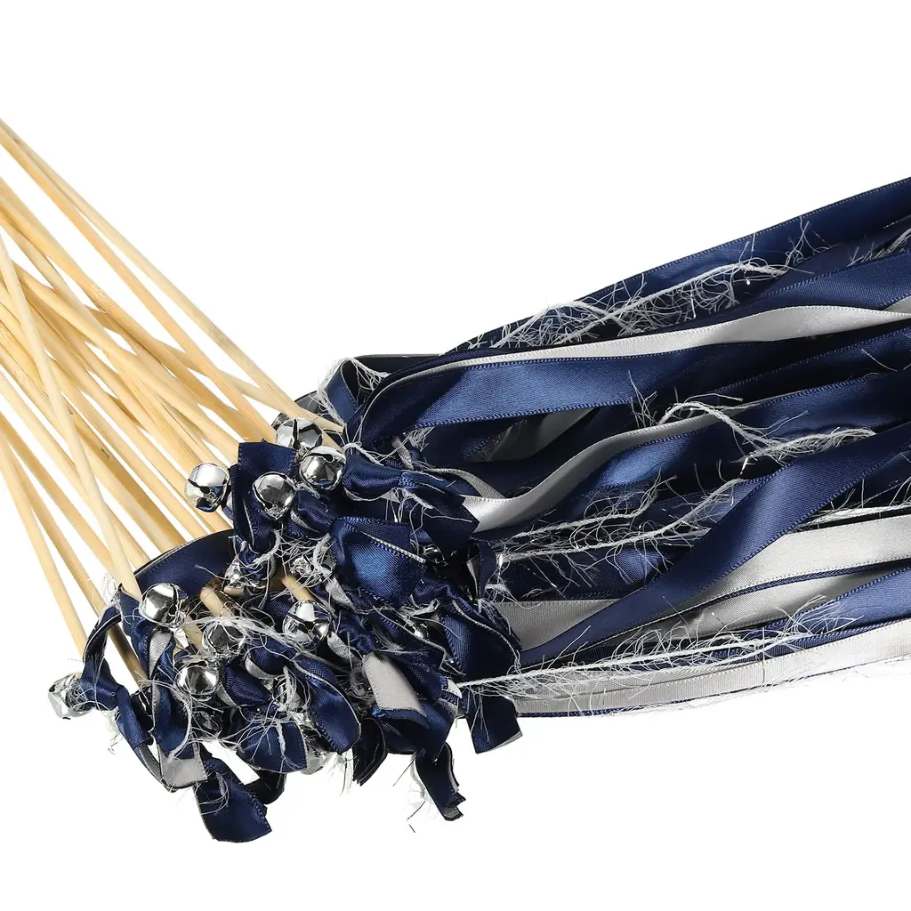 24pcs Ribbon Fairy Wand Silk Stick Streamer With Bell For Wedding - Navy Blue,grey