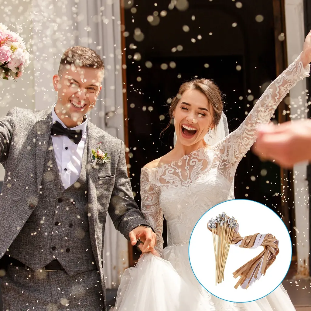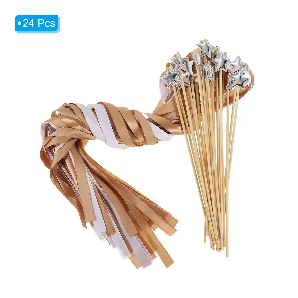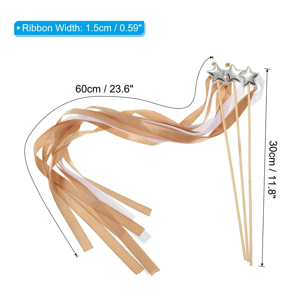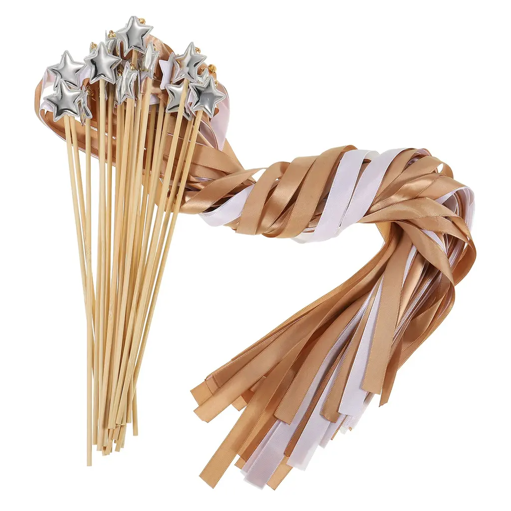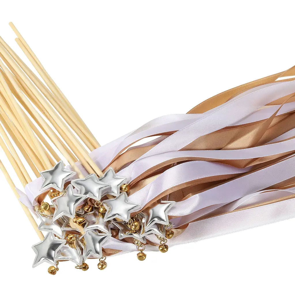 The beautiful and romantic fairy wands can add a magical touch to weddings, bridal showers, send off, birthdays, party favors, other special events; Also a fun accessory for costumes, dress-up play, or cheerful holiday celebrations.Specification Color: Brown, WhiteRibbon Width: 1.5cm / 0.59 inchRibbon Length: 60cm / 23.62 inchStick Length: 30cm / 11.81 inchPacking List: 24 x Decorative Ribbon Fairy Wands with BellsAdvantageMade of lightweight satin ribbon and star-shaped ornament, a wooden wand handle is comfortable to hold and wave around. The colorful ribbons create an enchanting and playful appearance, the jingle bells add a melodious and joyous sound while waving.InstructionHold the wand by the handle, ensuring a secure grip. Wave the wand gently in the air to create flowing movements with the ribbons.NOTEKeep them away from open flame or heat sources to prevent damage. Ensure that the ribbons are securely attached to the wand to avoid potential harm.