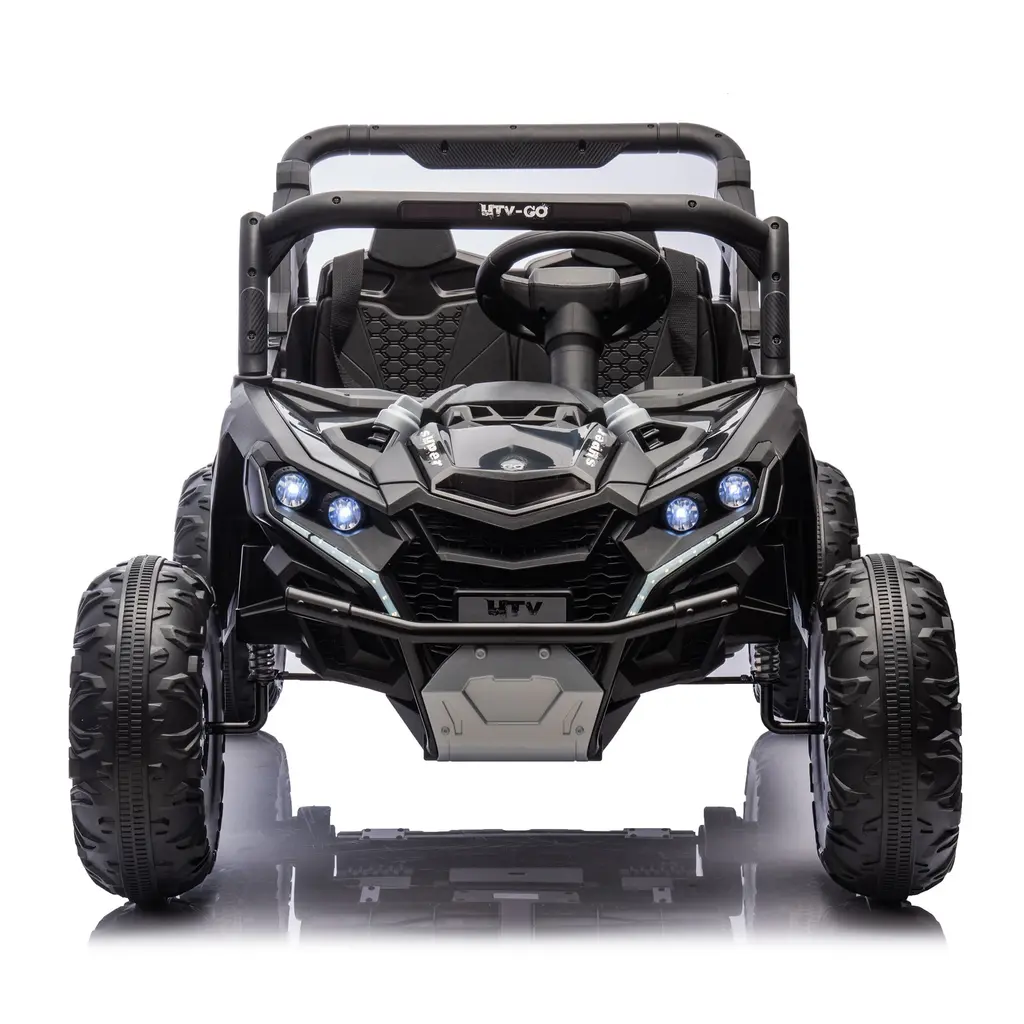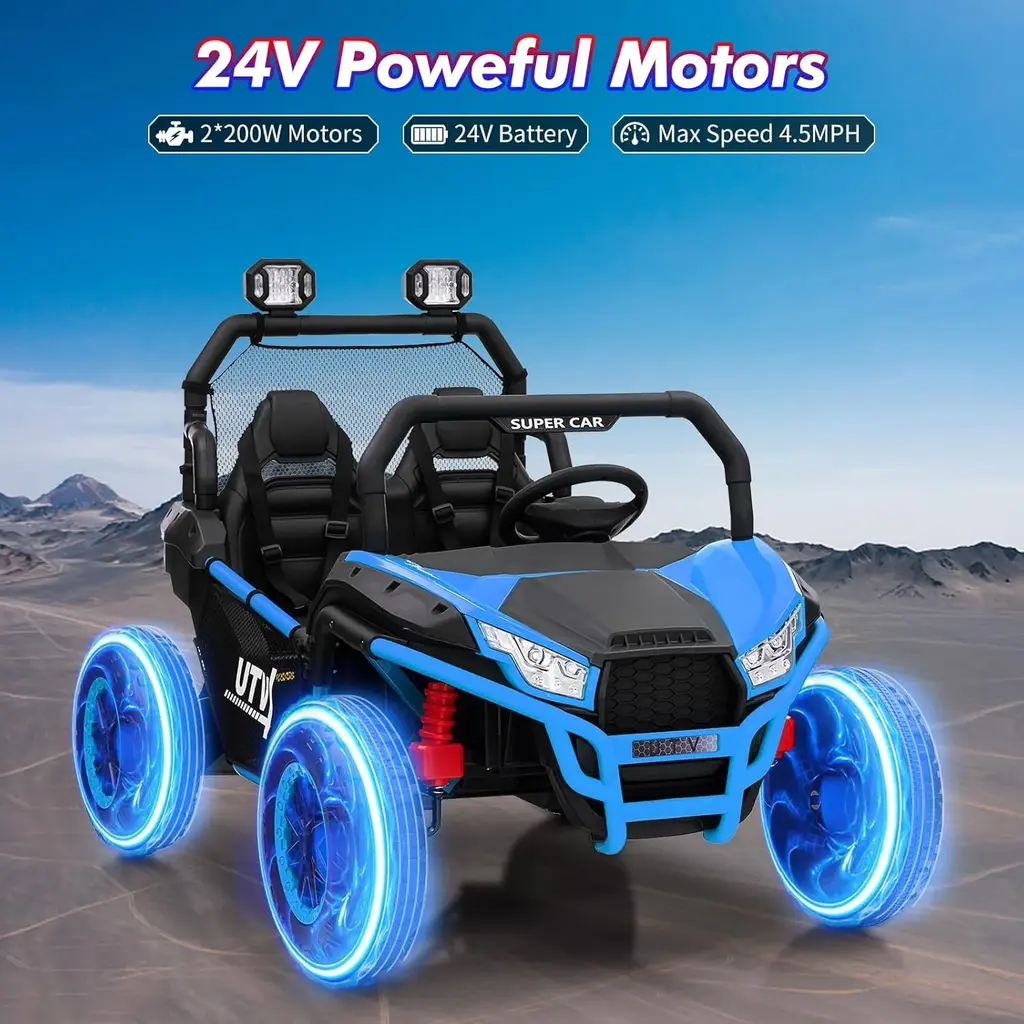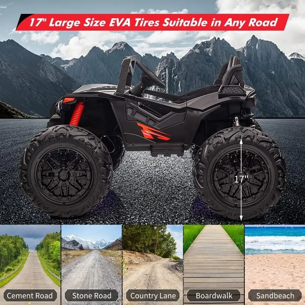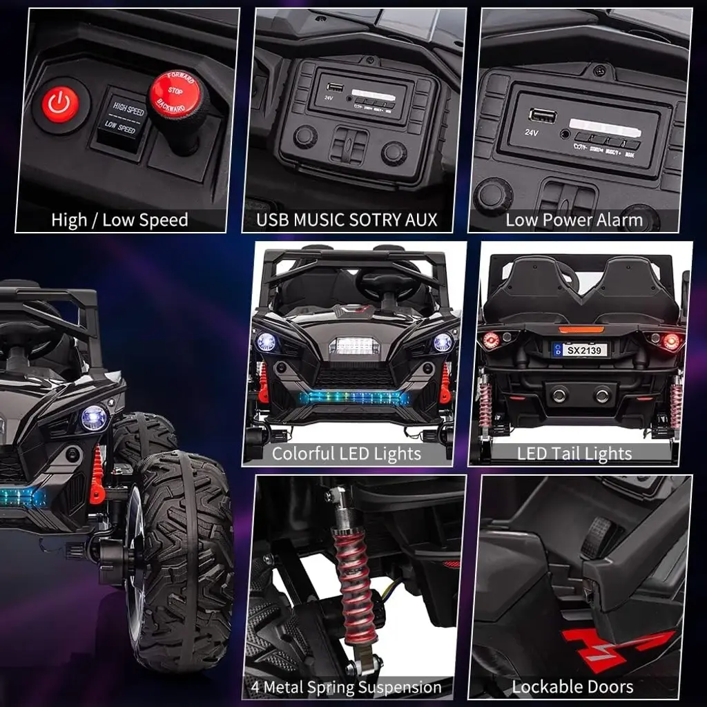Powerful 24V 10ah Battery & 4 Motors: This 2-seat UTV is equipped with 80W2 and 120W2 motors, providing robust power for an exciting off-road experience. Coupled with 17" extra-large EVA wheels, it excels in various terrains, delivering continuous power and performance in any condition.Spacious and Comfortable Seating: With an overall size of 49.6"*40.9"*30.5" (L x W x H) and a wide 20.5" seat, this UTV is designed to comfortably accommodate two kids (under 4 years) or a single child aged 37 months to 8 years old. It includes two seats with individual safety belts for secure rides.Vibrant LED Lights and Entertainment Features: The ride-on vehicle features dazzling front and tail LED lights, along with music, USB connectivity, and a horn, enhancing the fun for children. The smooth and quiet EVA wheels ensure a pleasant driving experience while meeting safety standards certified by ASTM and CPC.Flexible Control Options: Parents can engage in the fun with the remote control feature, allowing them to operate the vehicle while children can also drive it independently using the foot pedal to control speeds. Each wheel has an independent bearing for smoother steering and enhanced maneuverability.Two-Pack Delivery for Convenience: Due to logistics restrictions, the UTV is delivered in two packages that may arrive on different days. After receiving both boxes, parents can easily follow the installation video and user manual to set up the vehicle for their child's enjoyment.